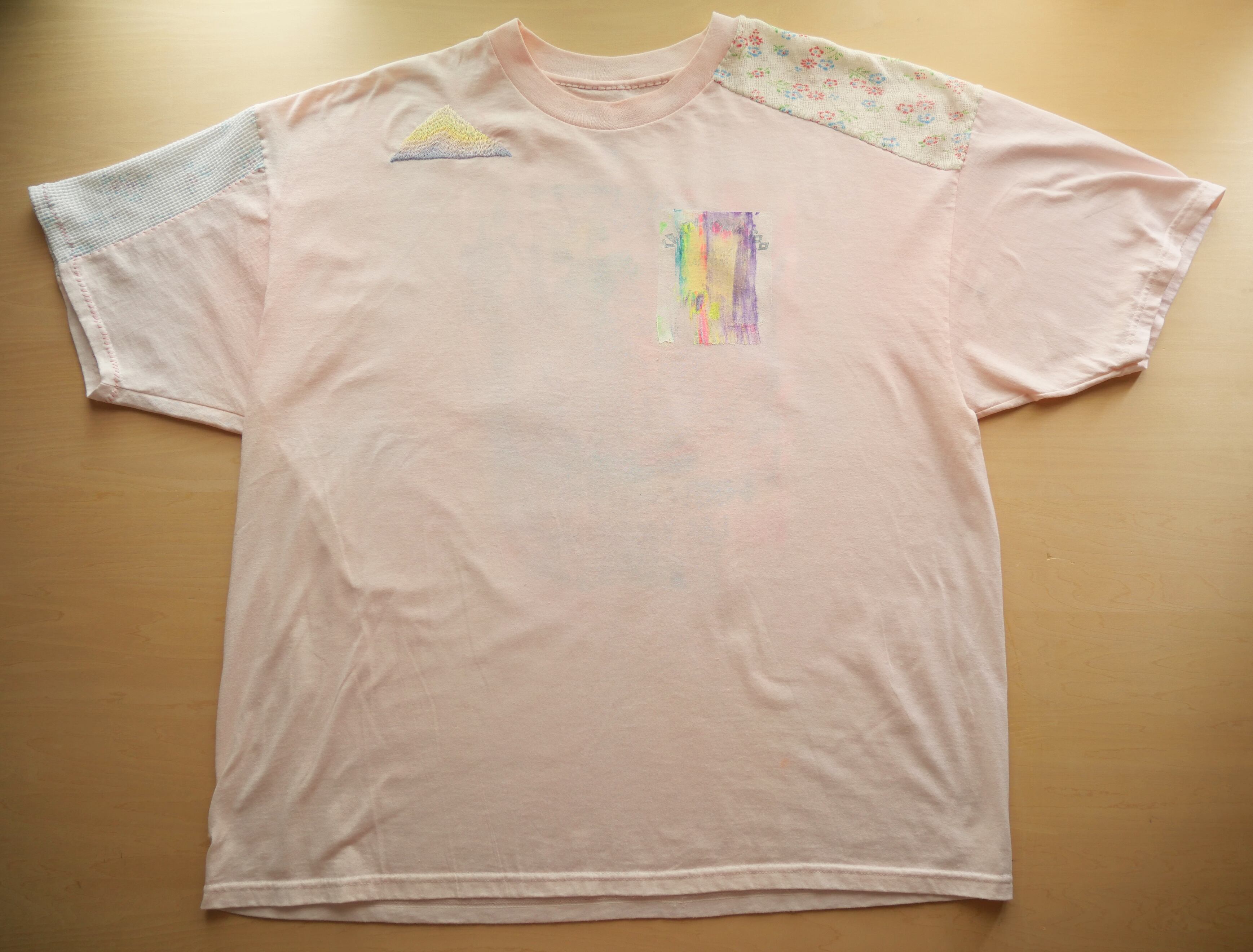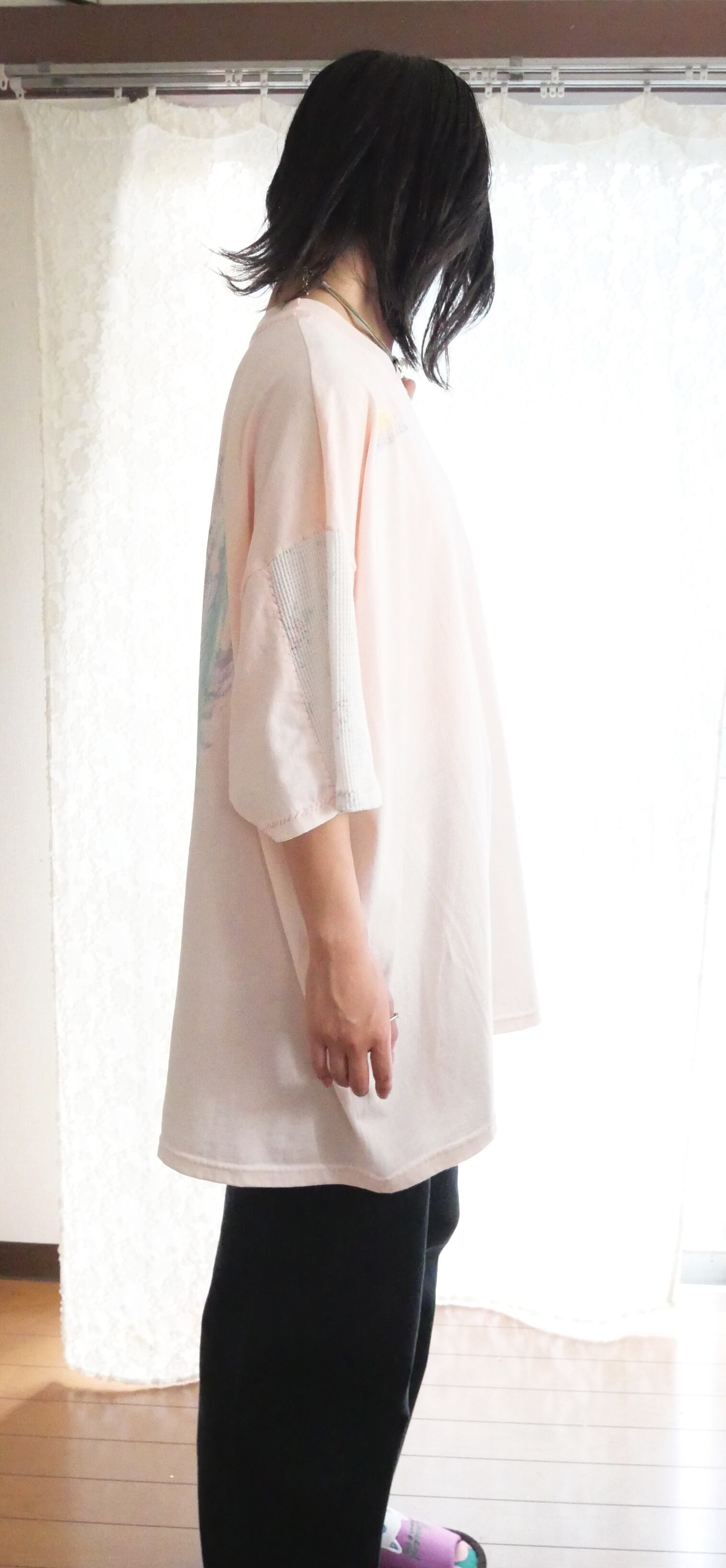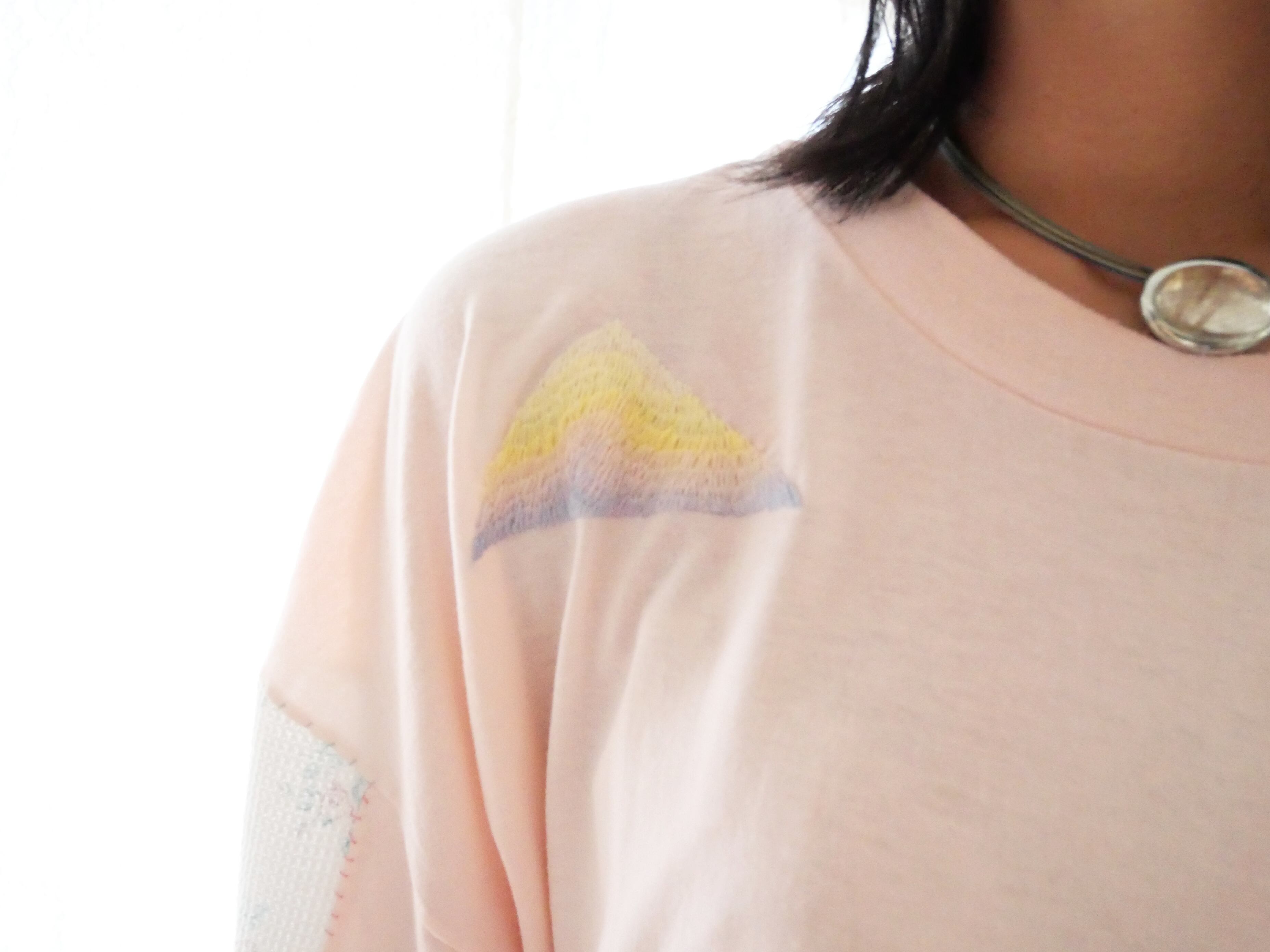 古着のTシャツをインド茜で染めた後、ヴィンテージのサーマル生地をパッチワークしてリメイクした半袖Tシャツ。