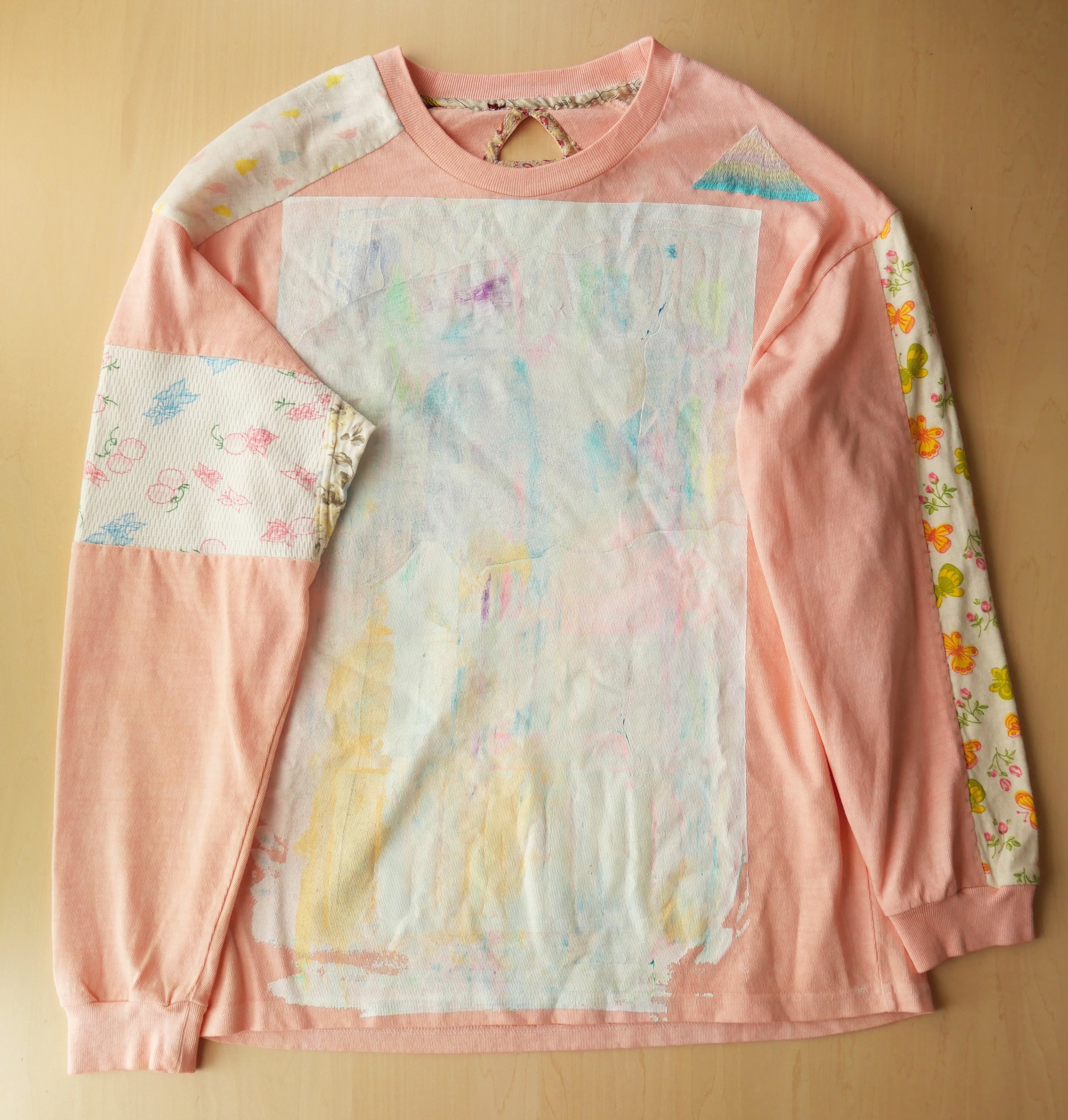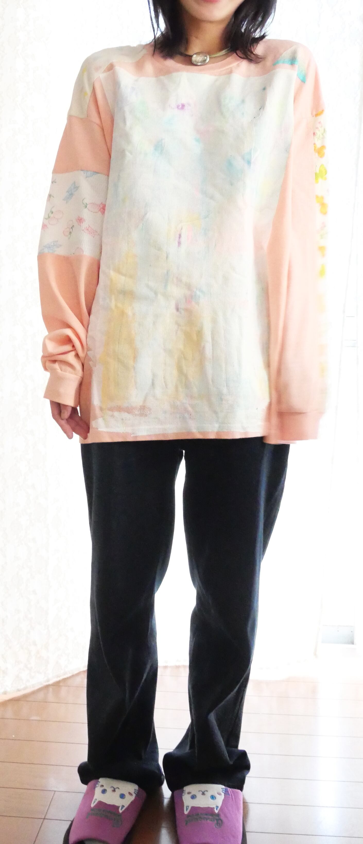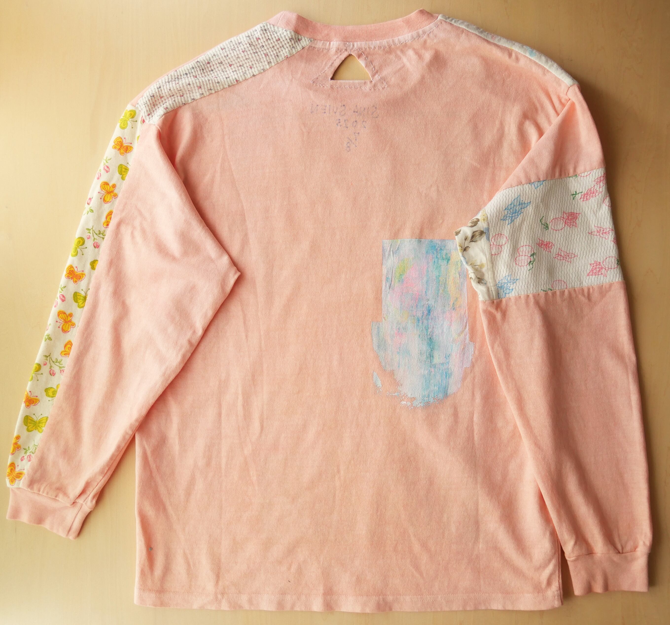 古着のTシャツをインド茜で染めた後、ヴィンテージのサーマル生地をパッチワークしてリメイクした長袖Tシャツ。