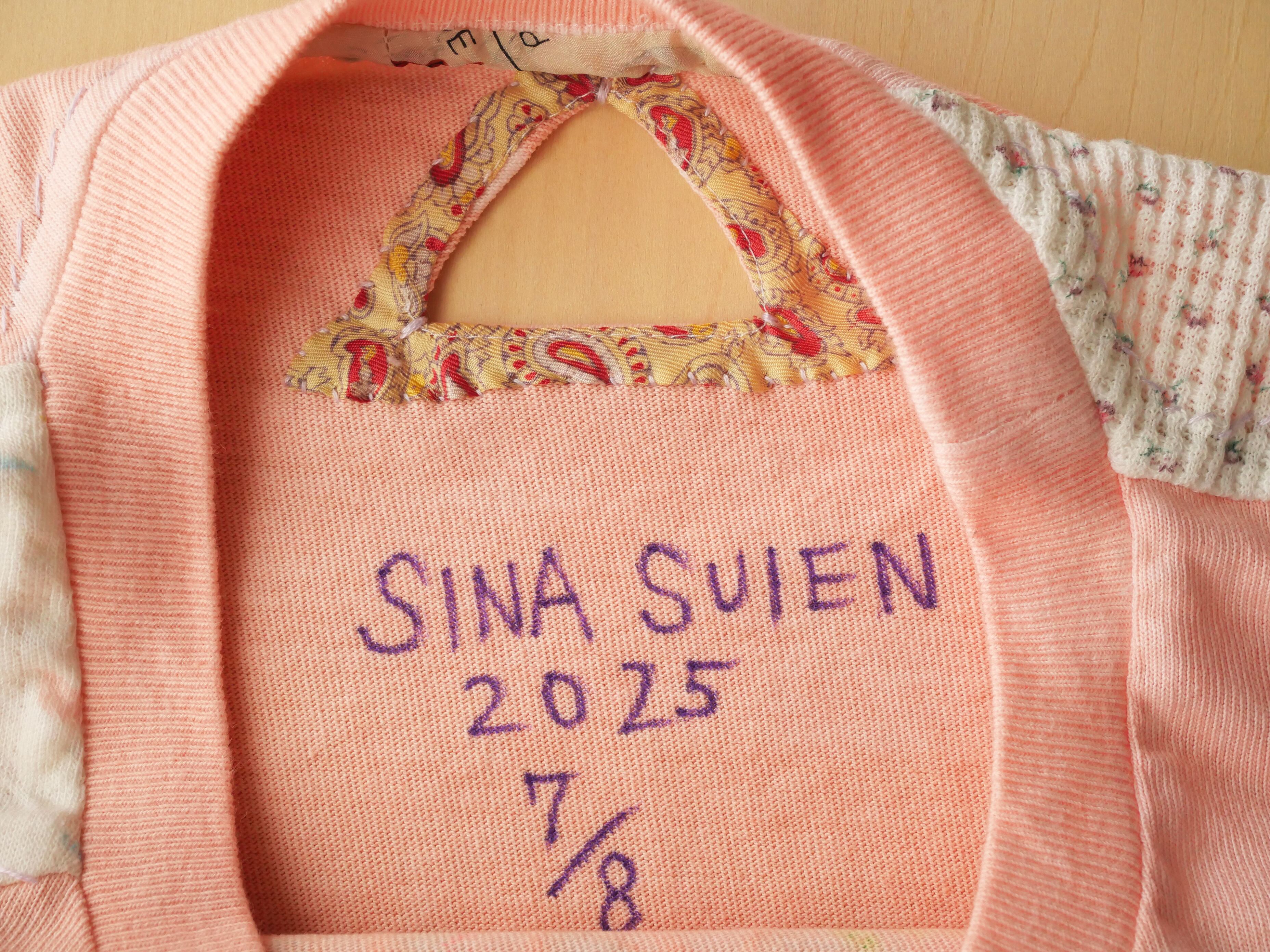 首元やパッチワーク部分に刺繍糸でハンドステッチ。