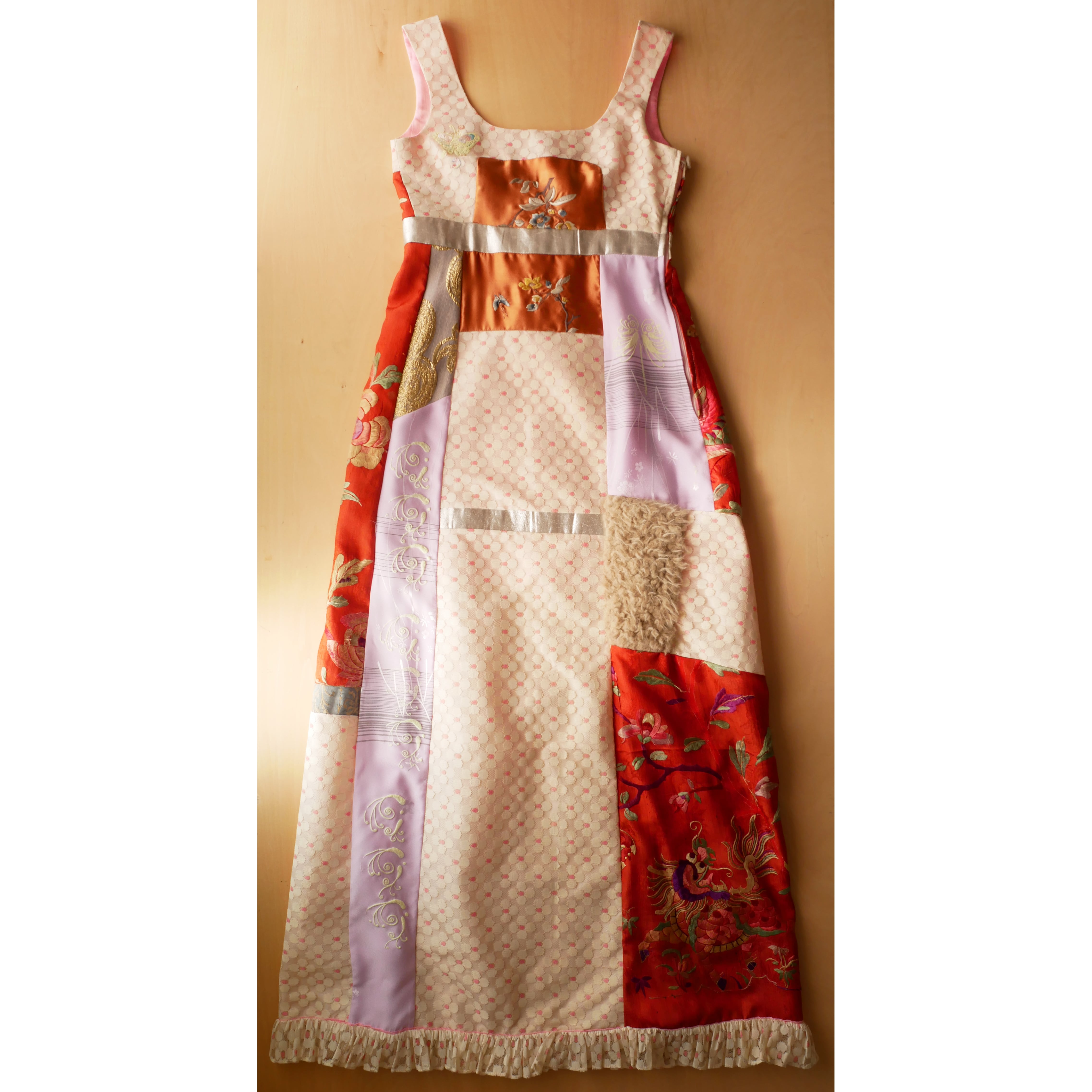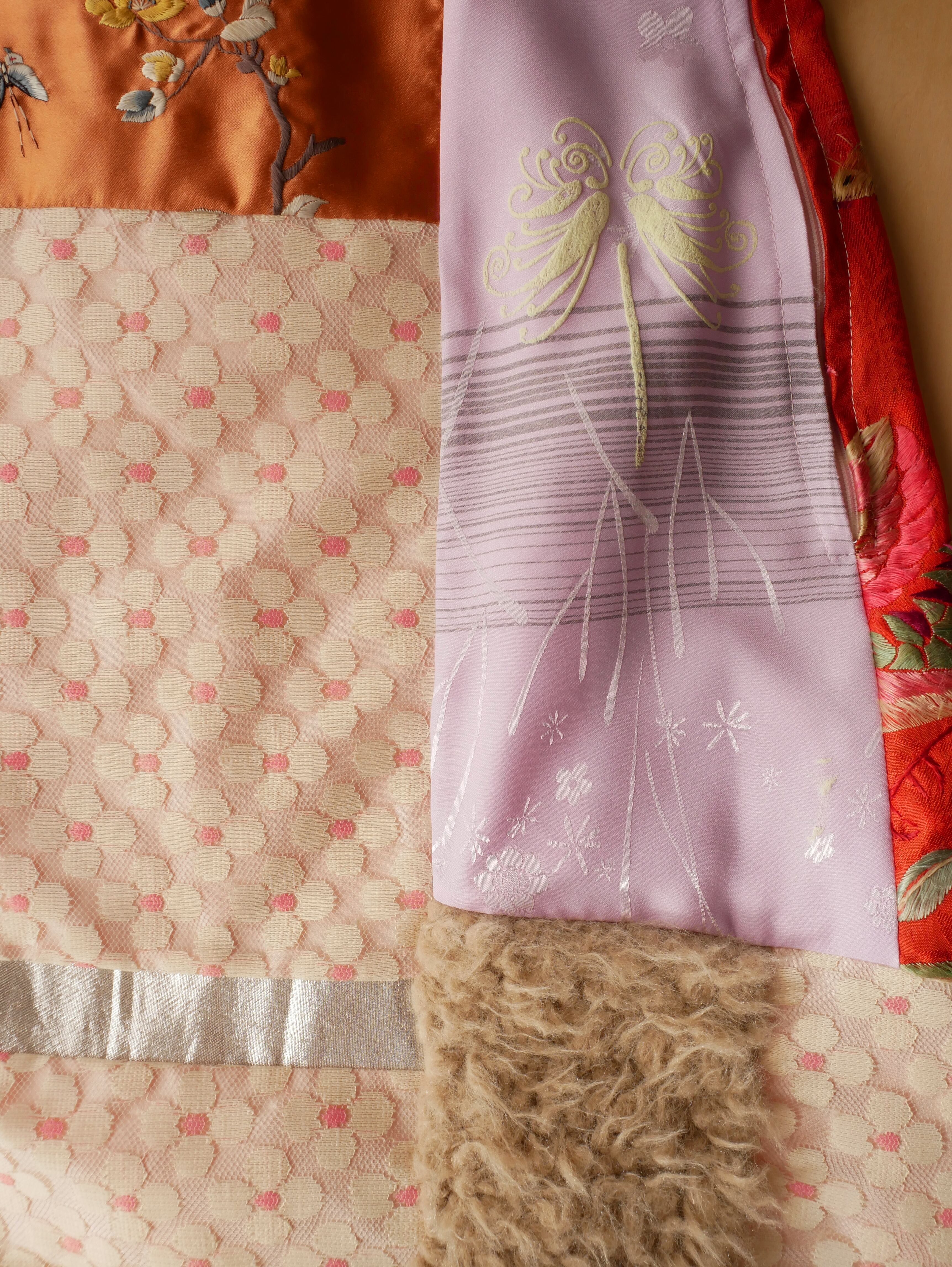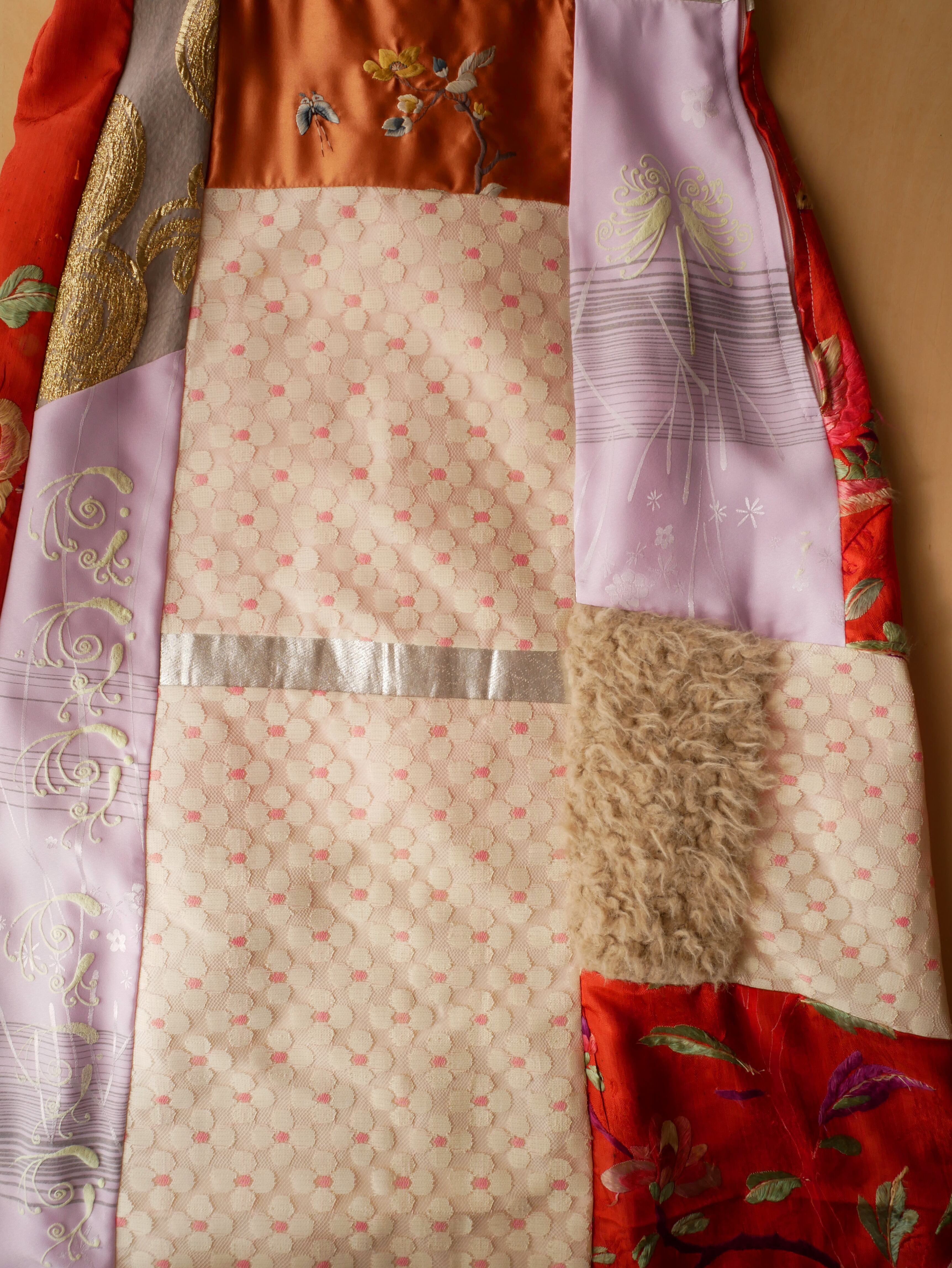 ヴィンテージレースや中国刺繍など贅沢な生地やフェイクファーがパッチワークされた遊び心ある1着。