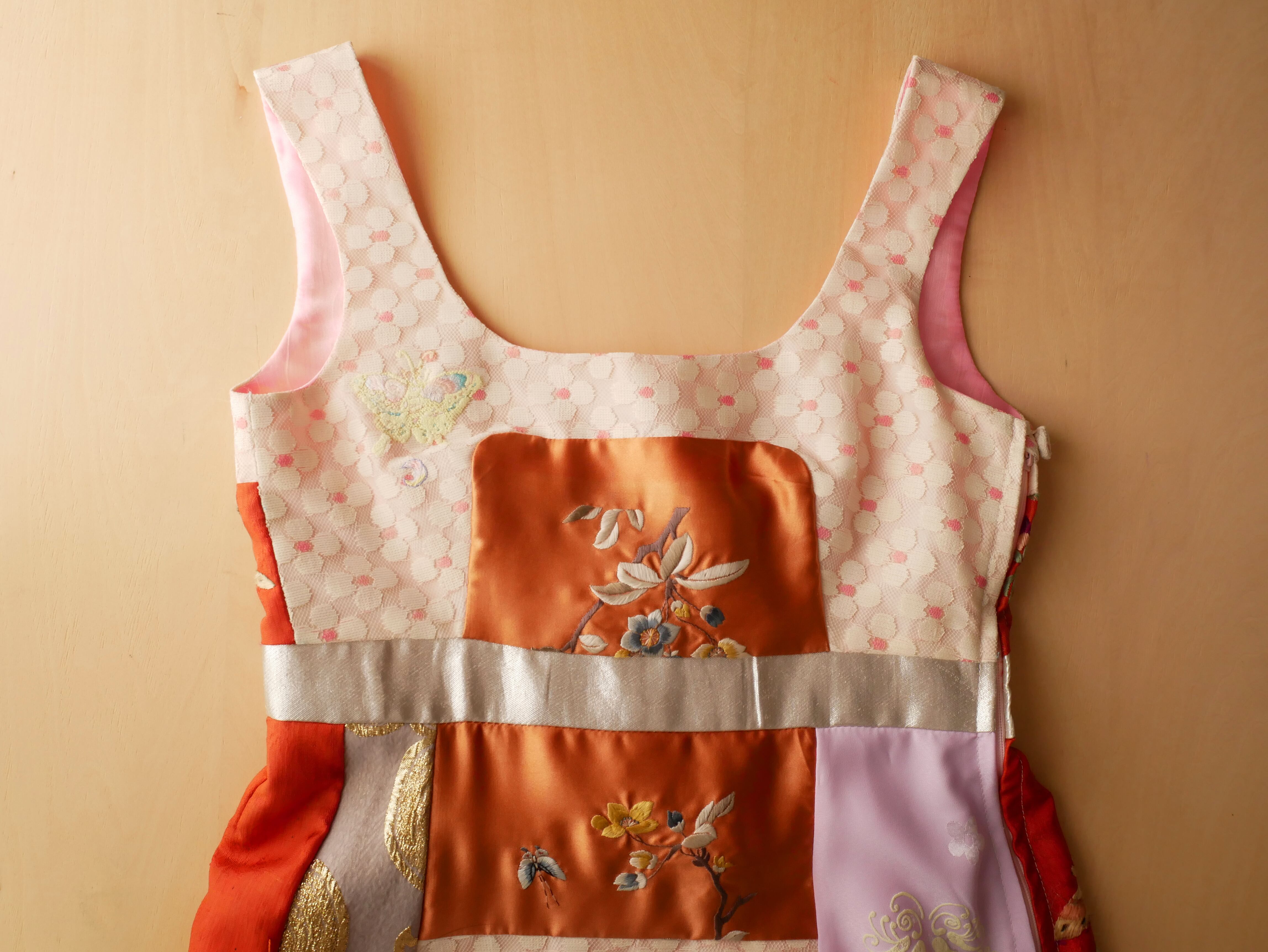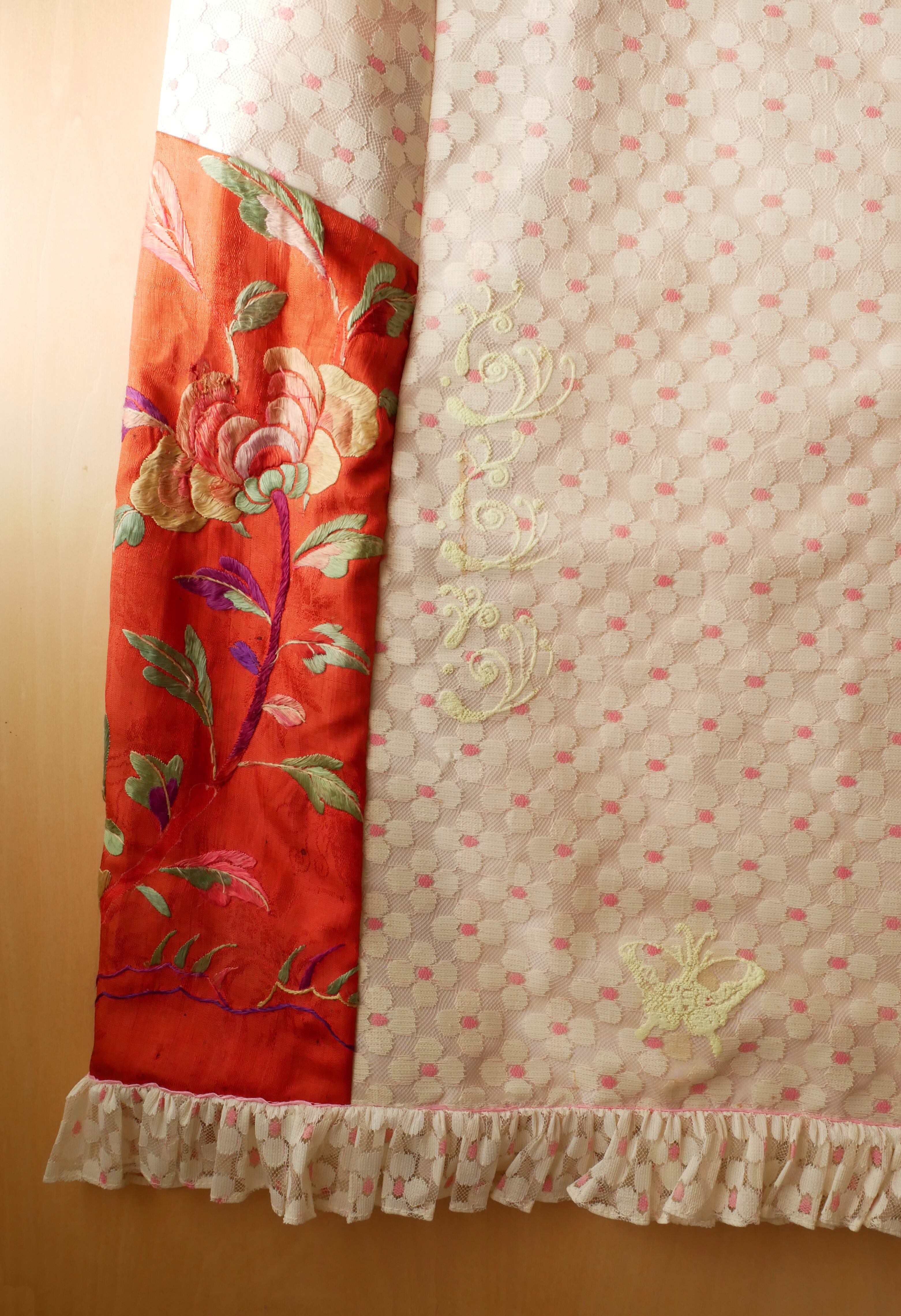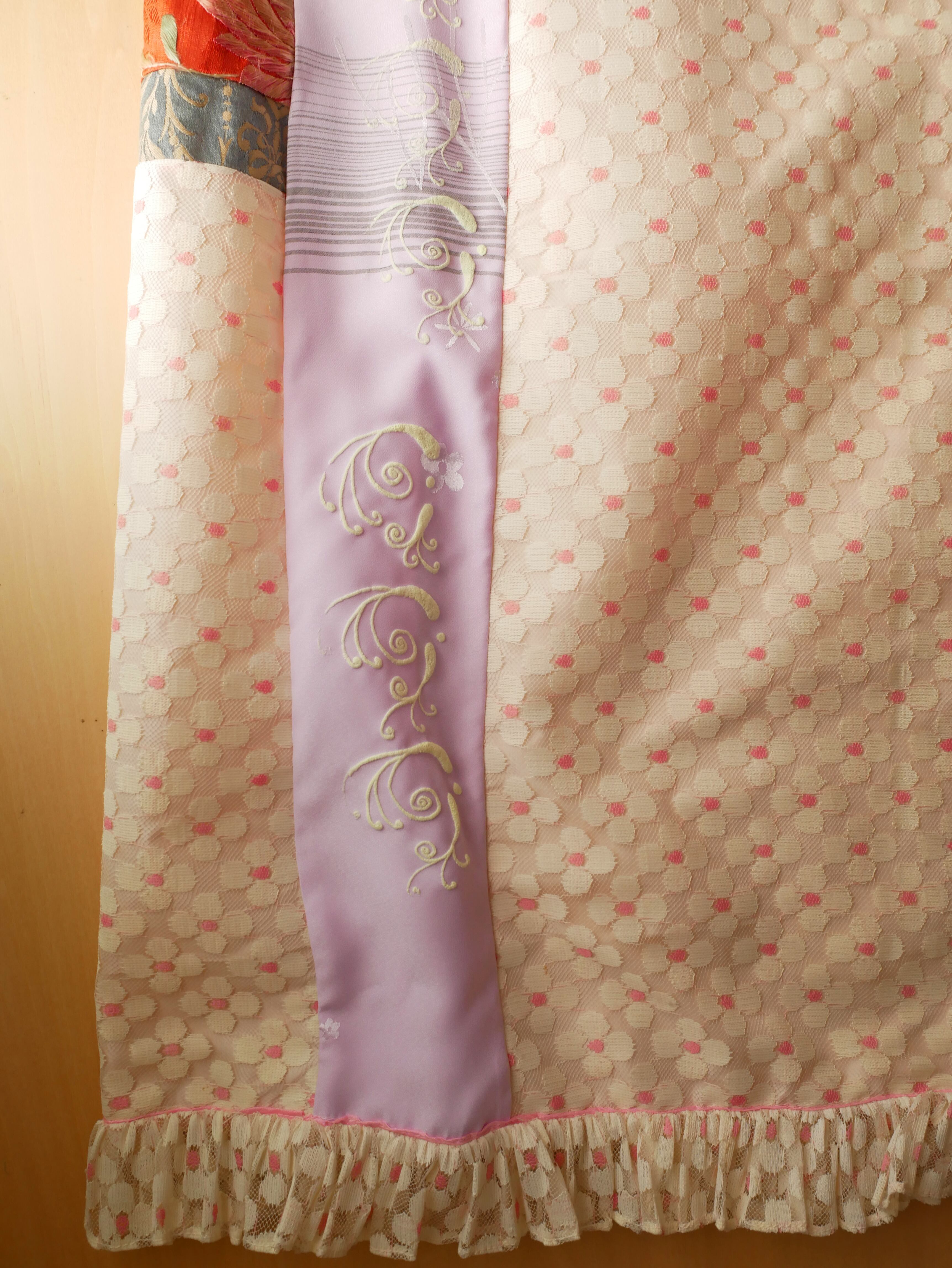 ヴィンテージレースや中国刺繍など贅沢な生地やフェイクファーがパッチワークされた遊び心ある1着。