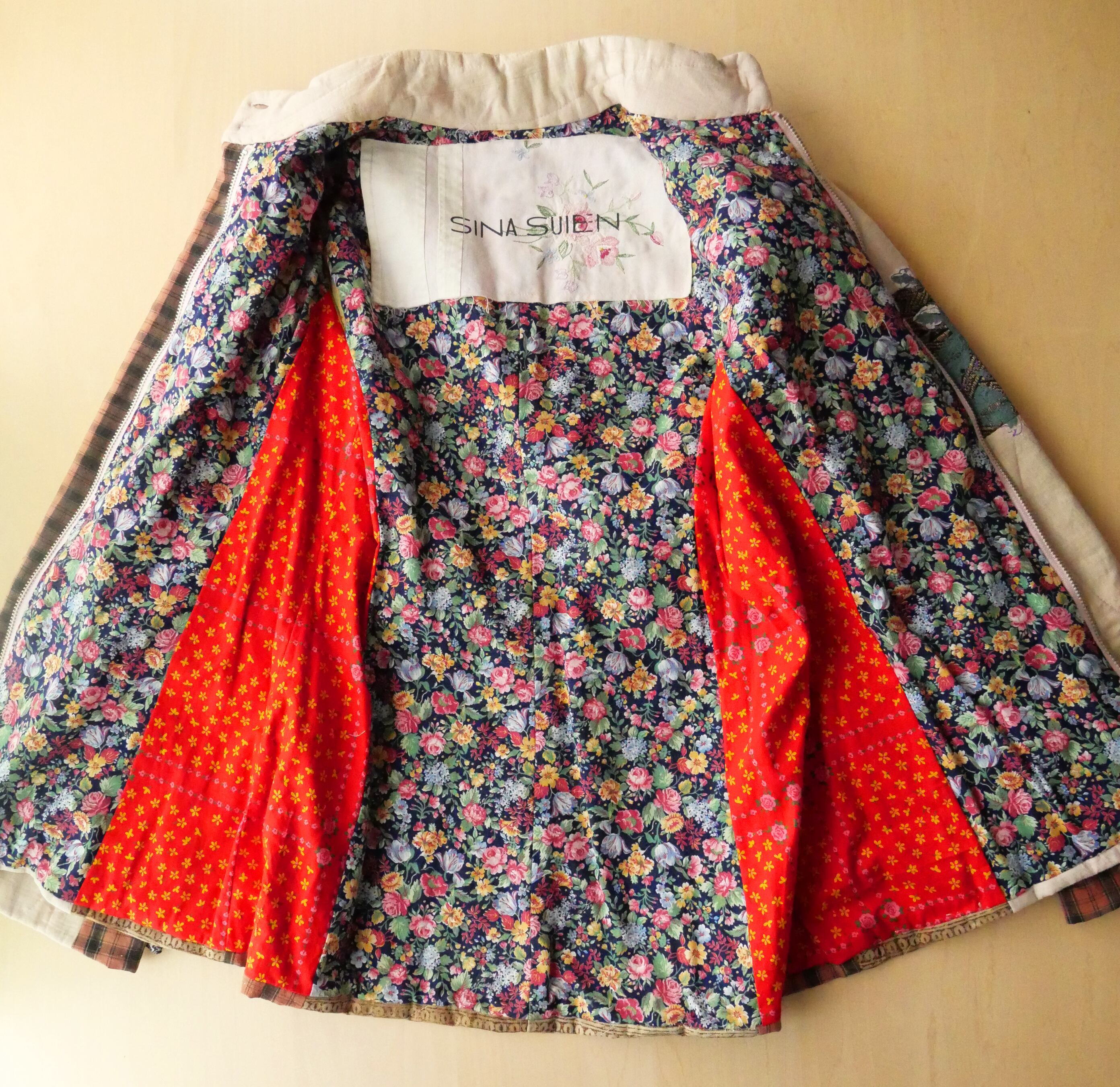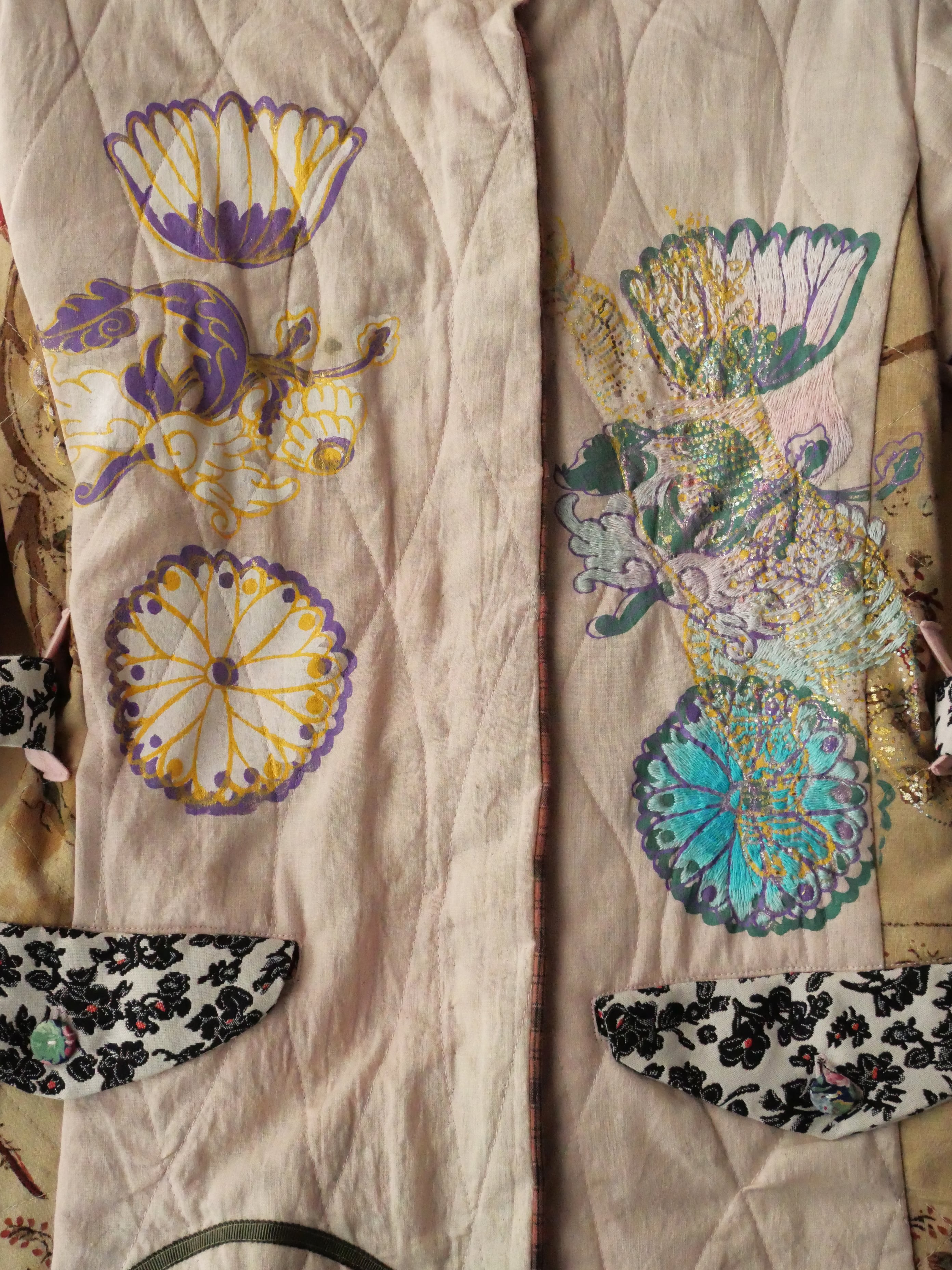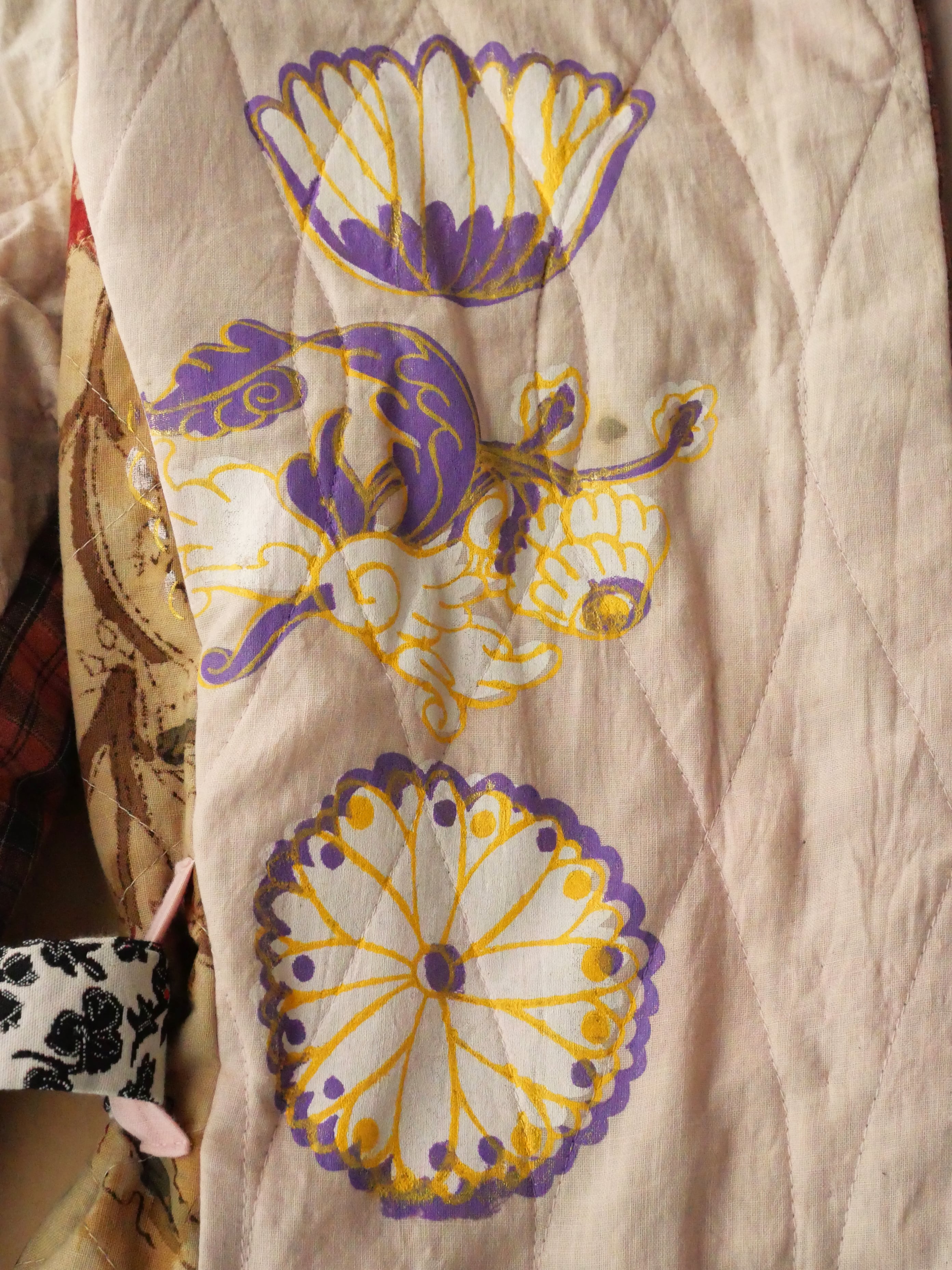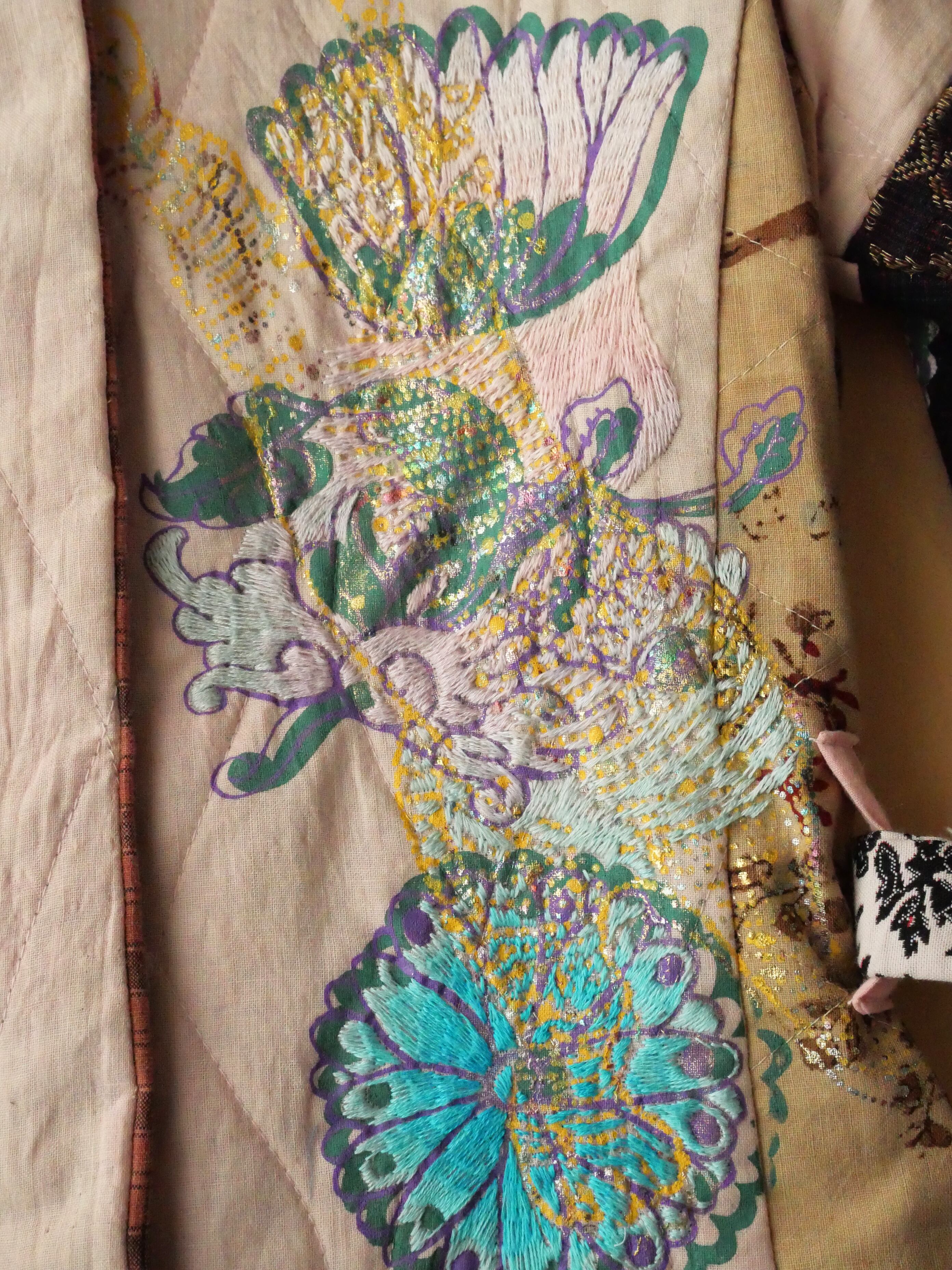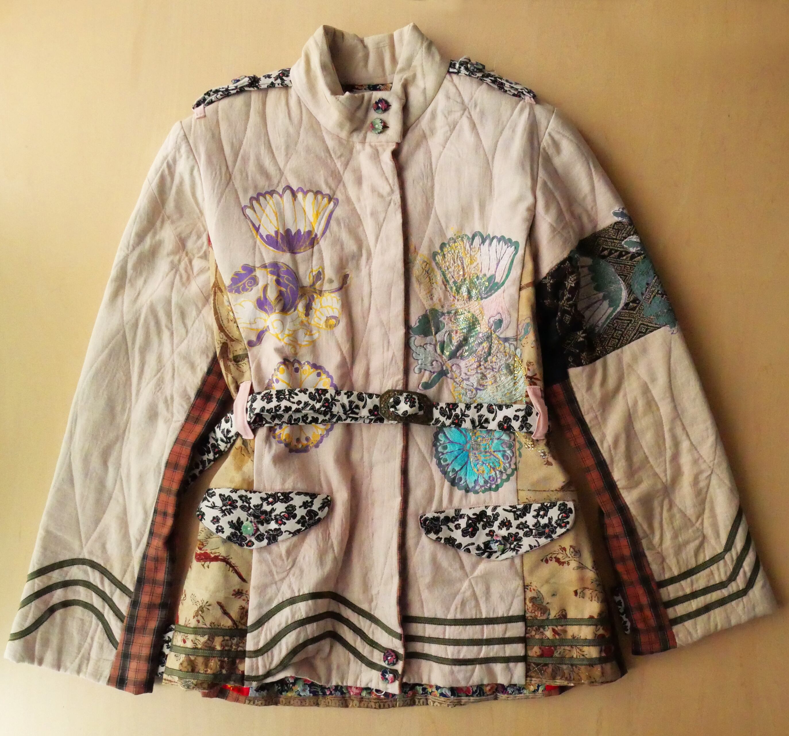 胸元に大きく手刷りによる花柄のシルクスクリーンプリントと、虎の刺繍。