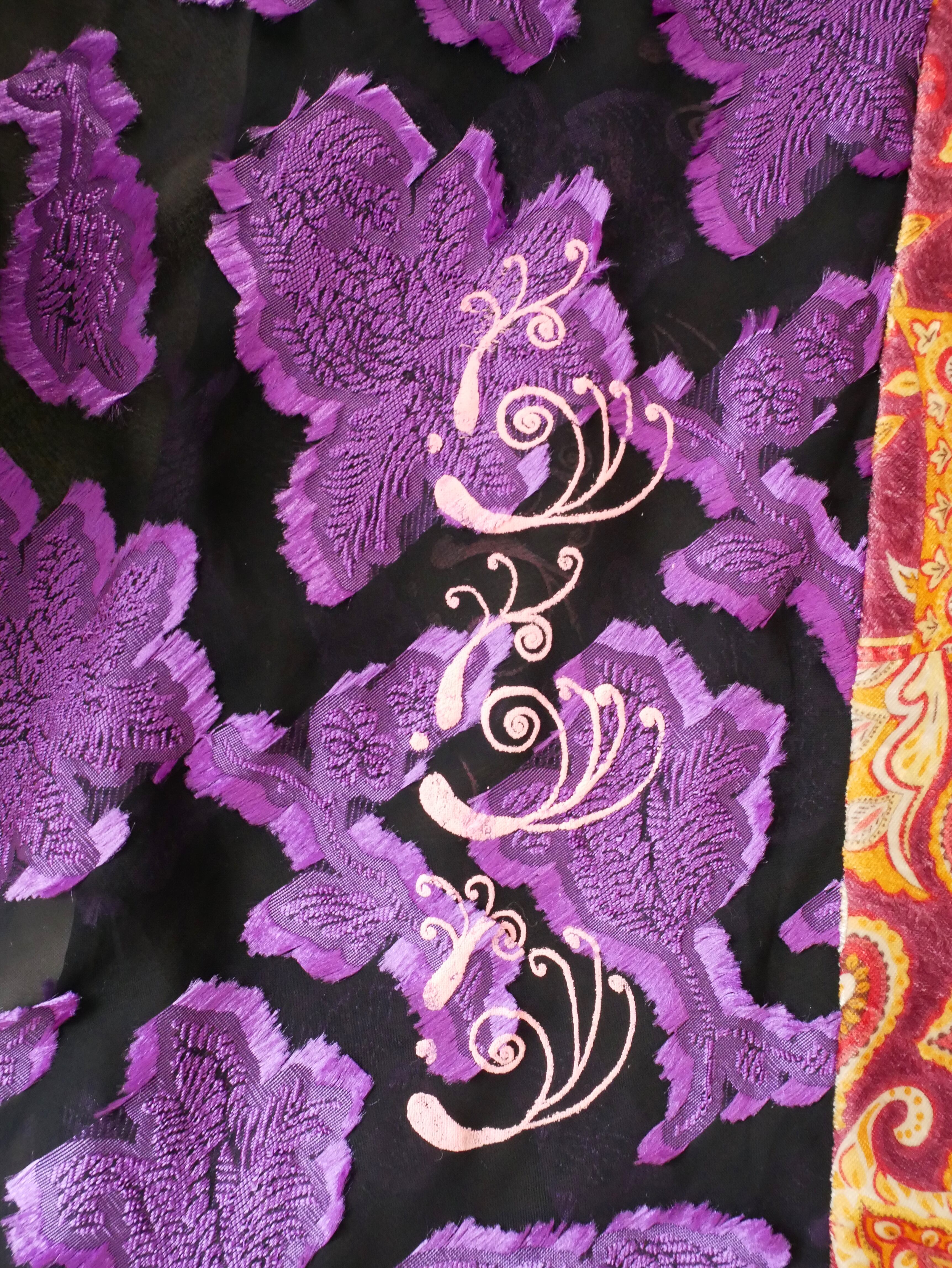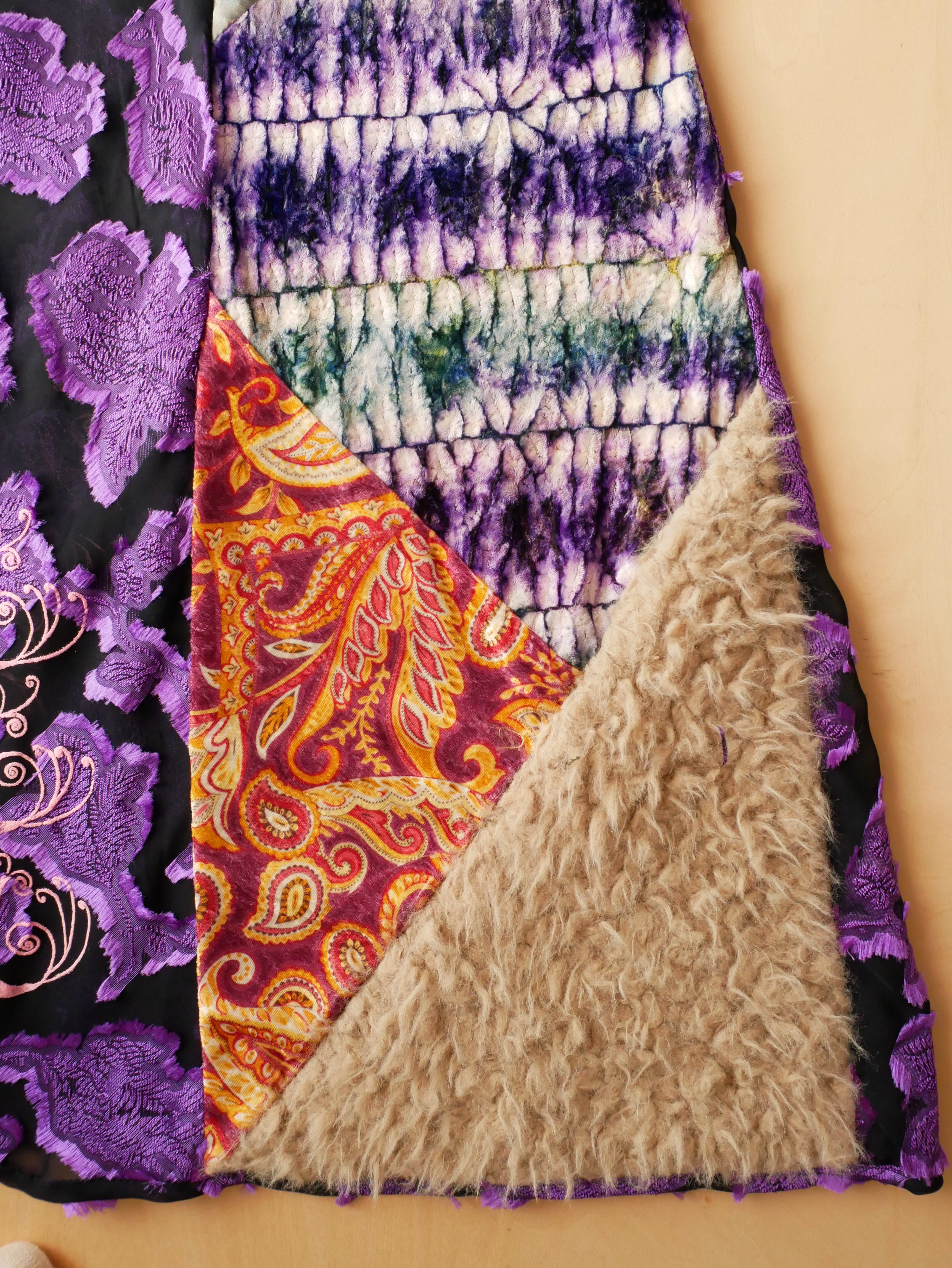 ヴィンテージな生地やフェイクファーがパッチワークされた遊び心ある1着。