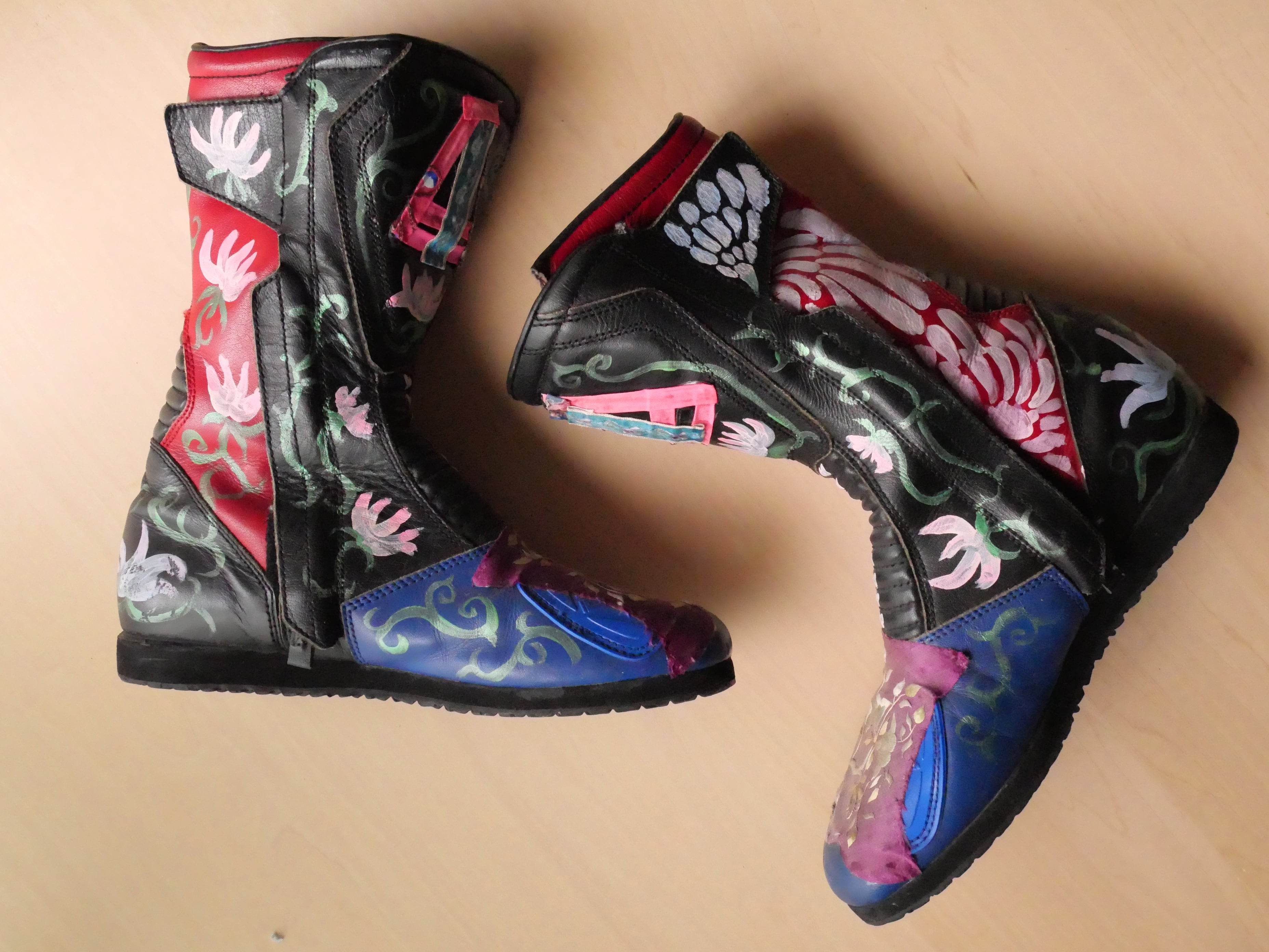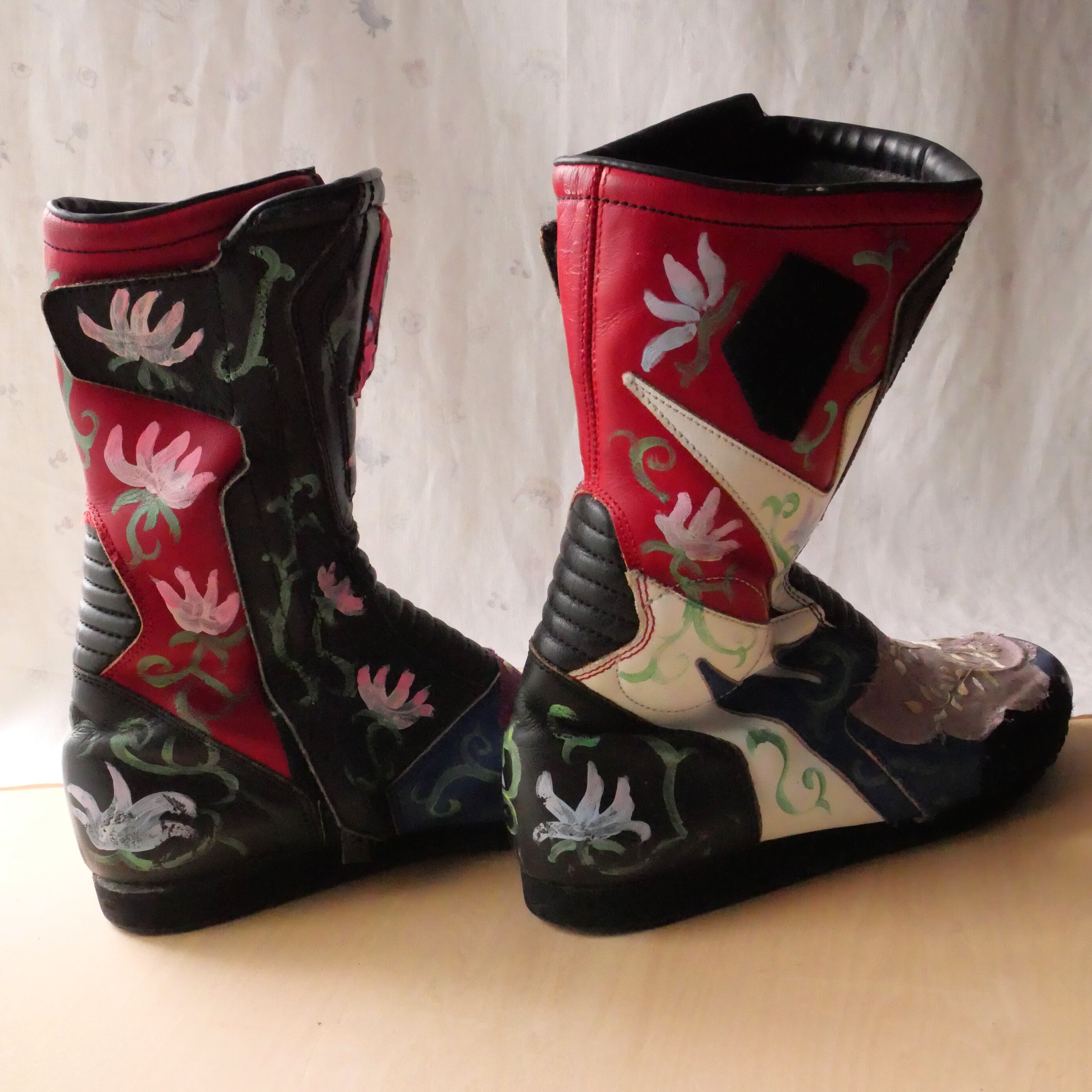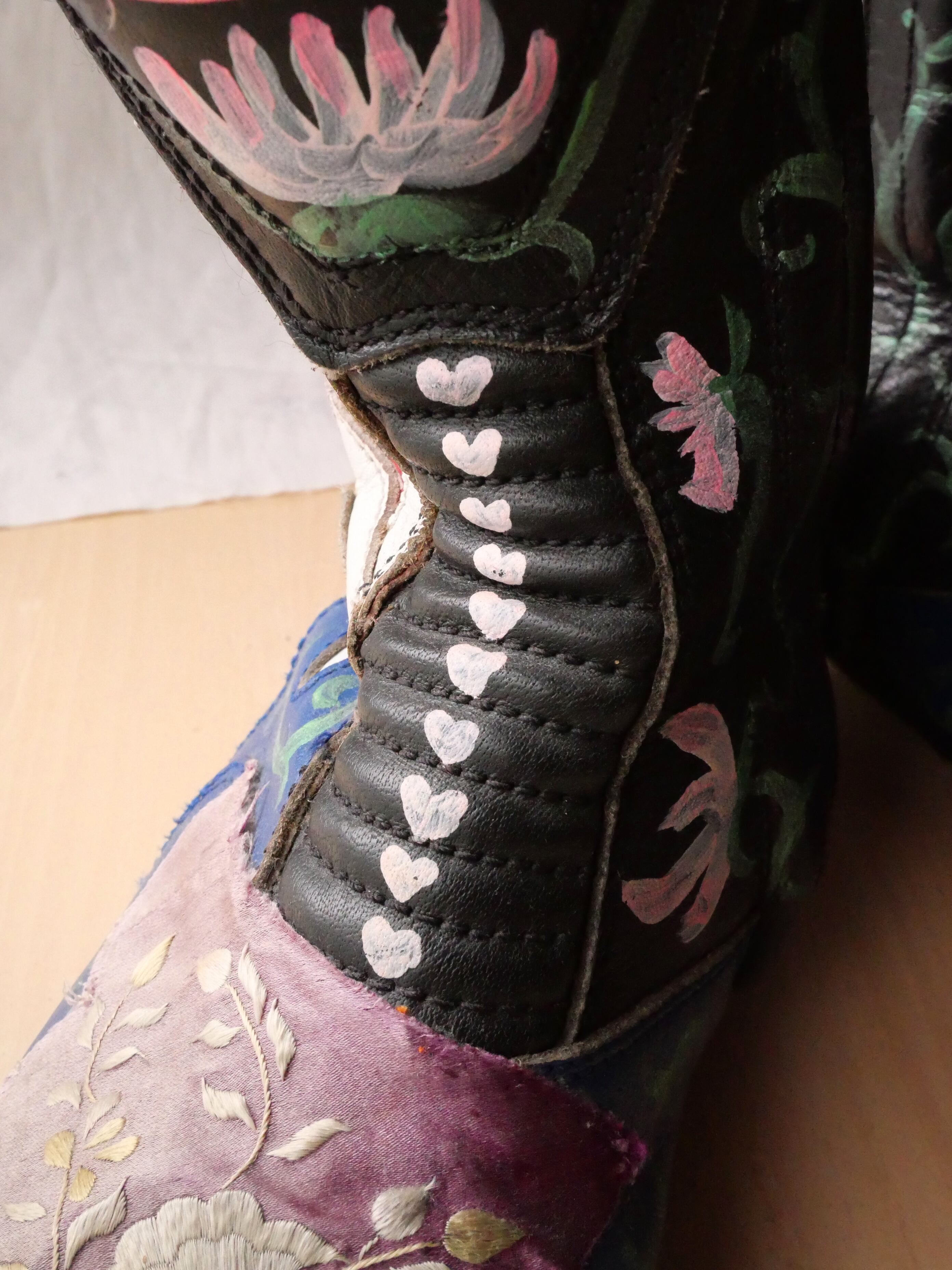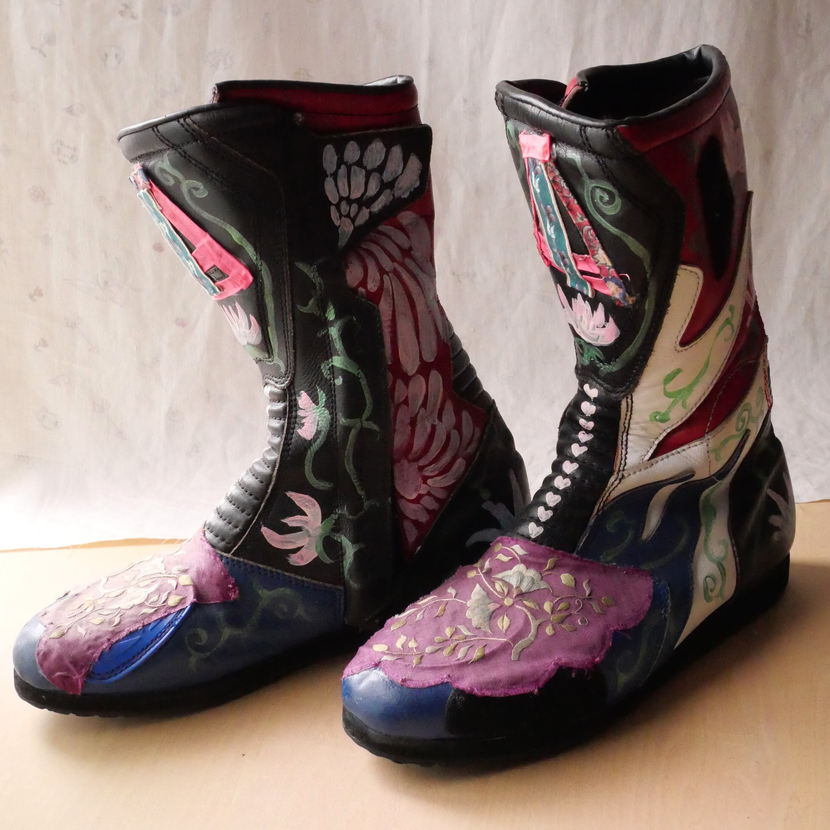 バイカースタイルのコレクション。ハンドペイントやヴィンテージの民族衣装の中国刺繍のパッチワークで装飾を施した1点ものです。