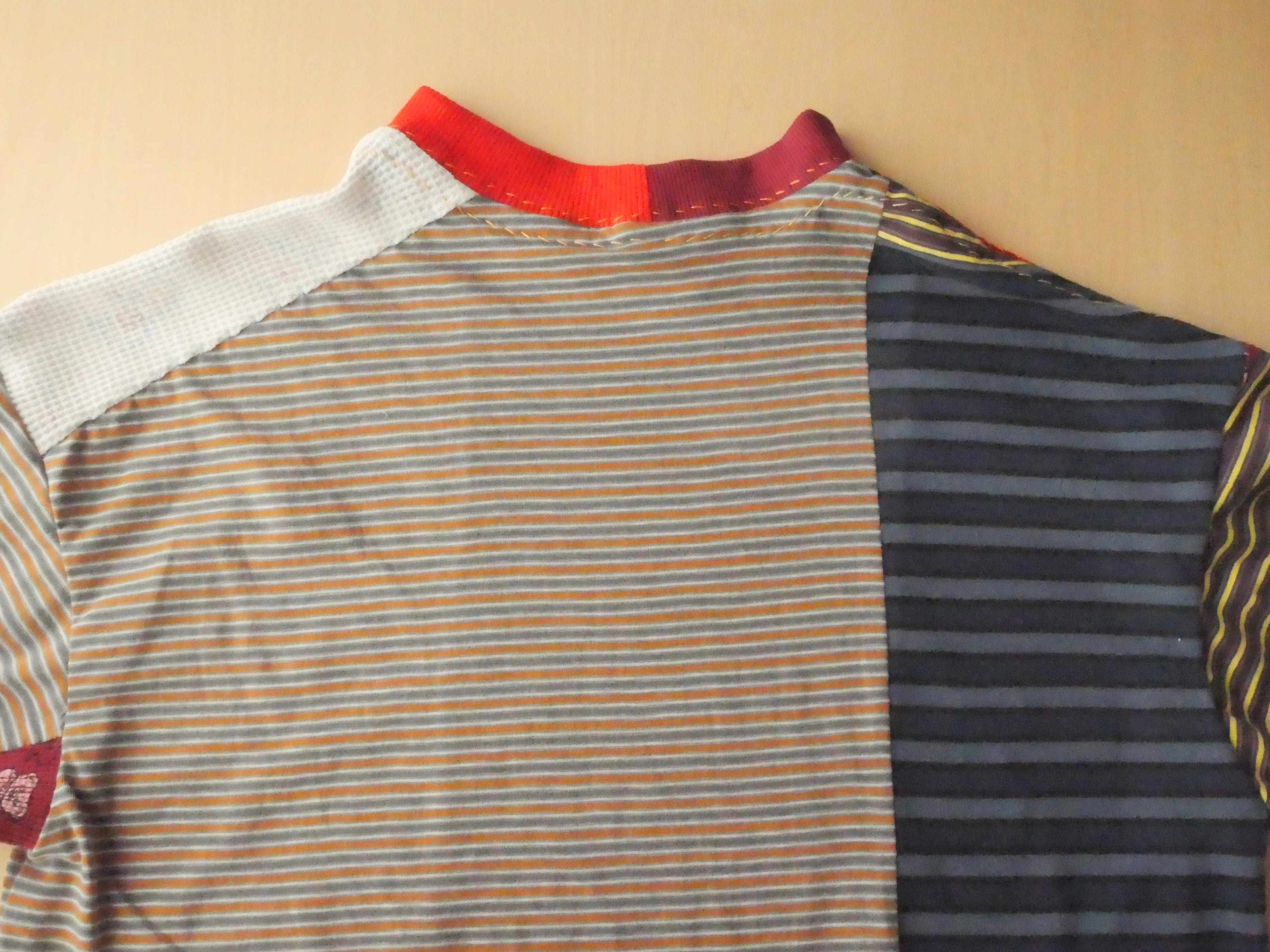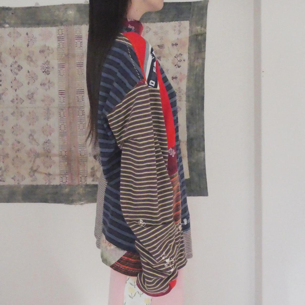 ヴィンテージのしましまシャツを使って土台を構成し、サーマル生地をパッチワークしました。