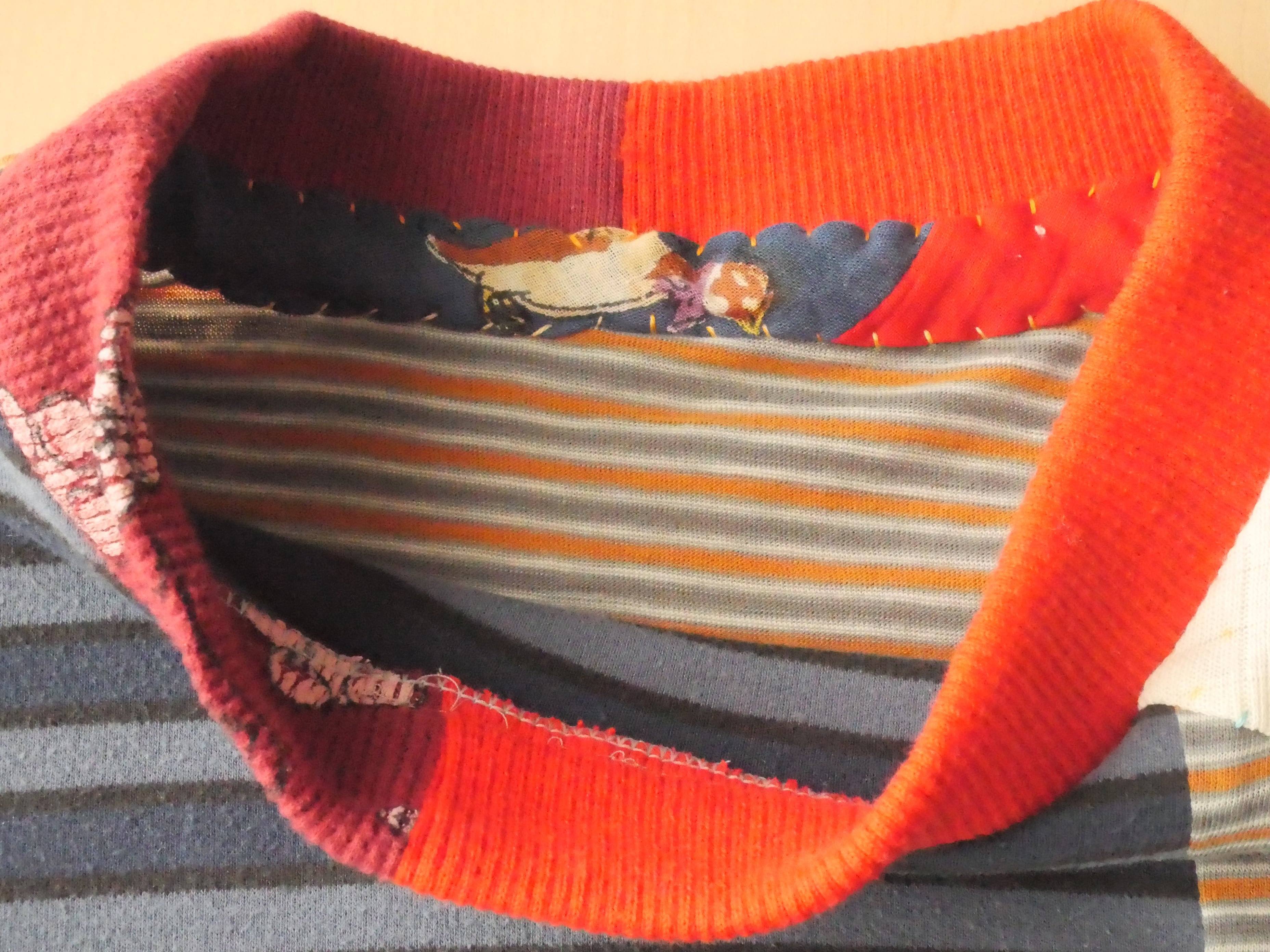 首周りの内側にはヴィンテージのスカーフを使った当て布を縫い付けています。ウサギ小屋ロゴのスペシャルタグは後ろ見頃の裾にミシンステッチ。