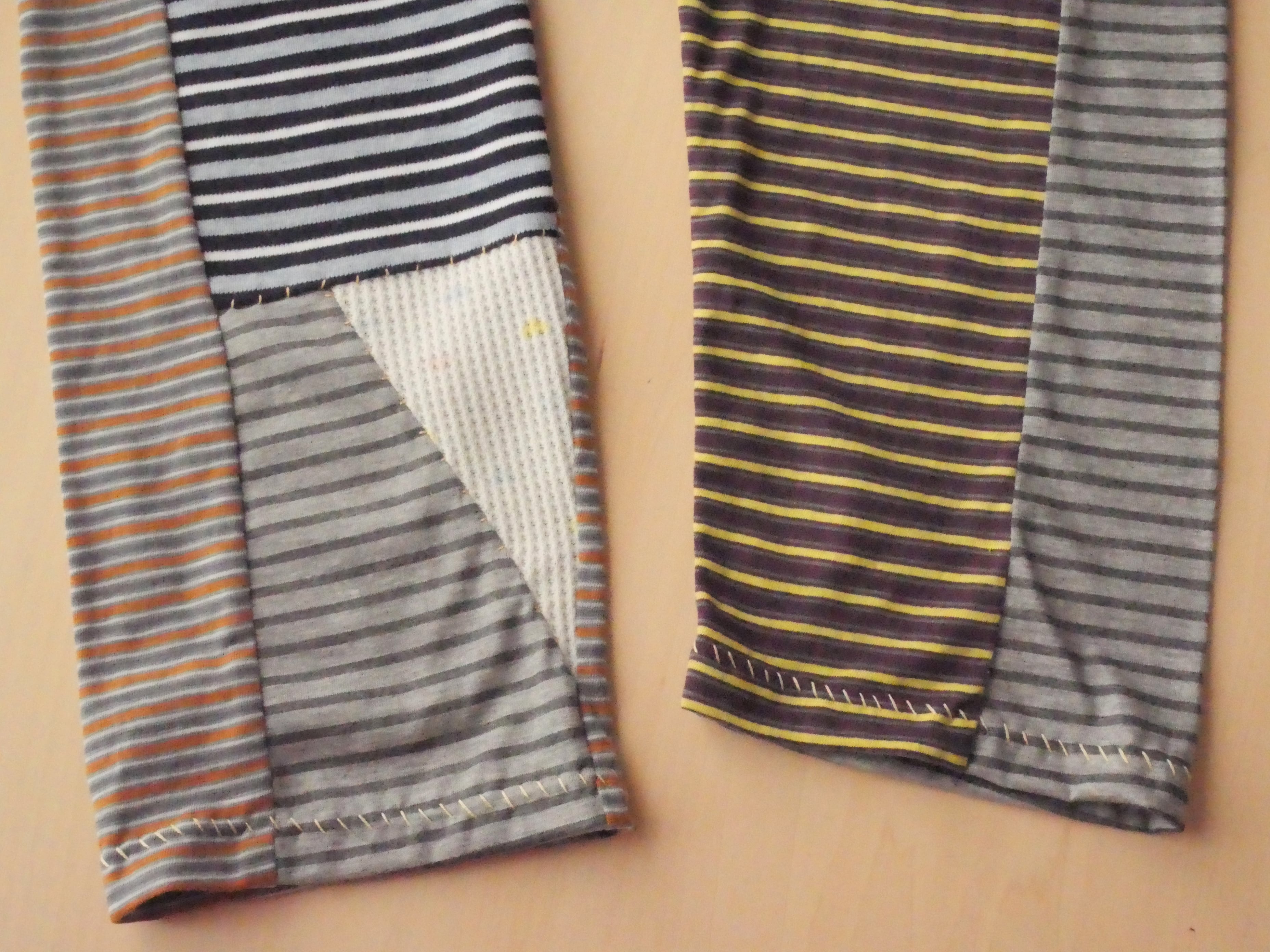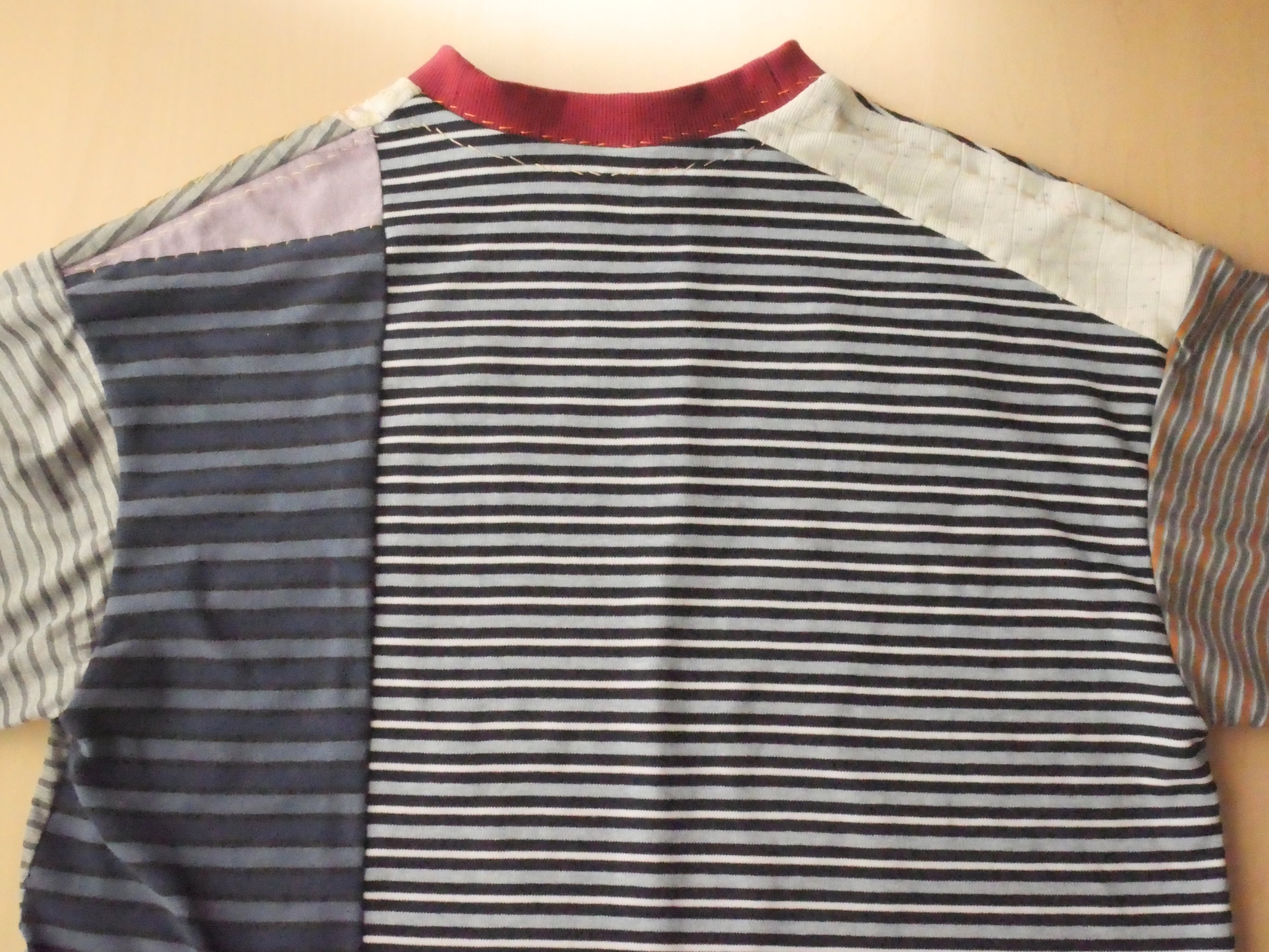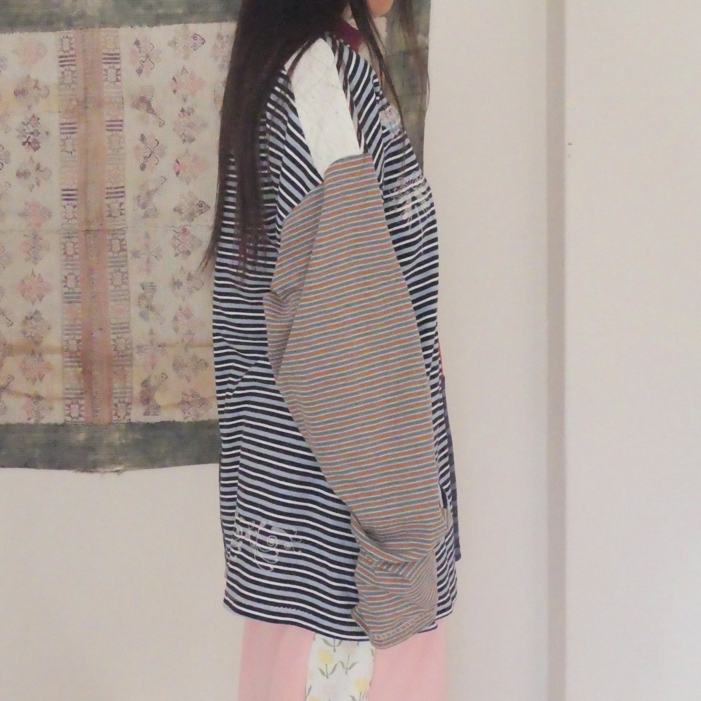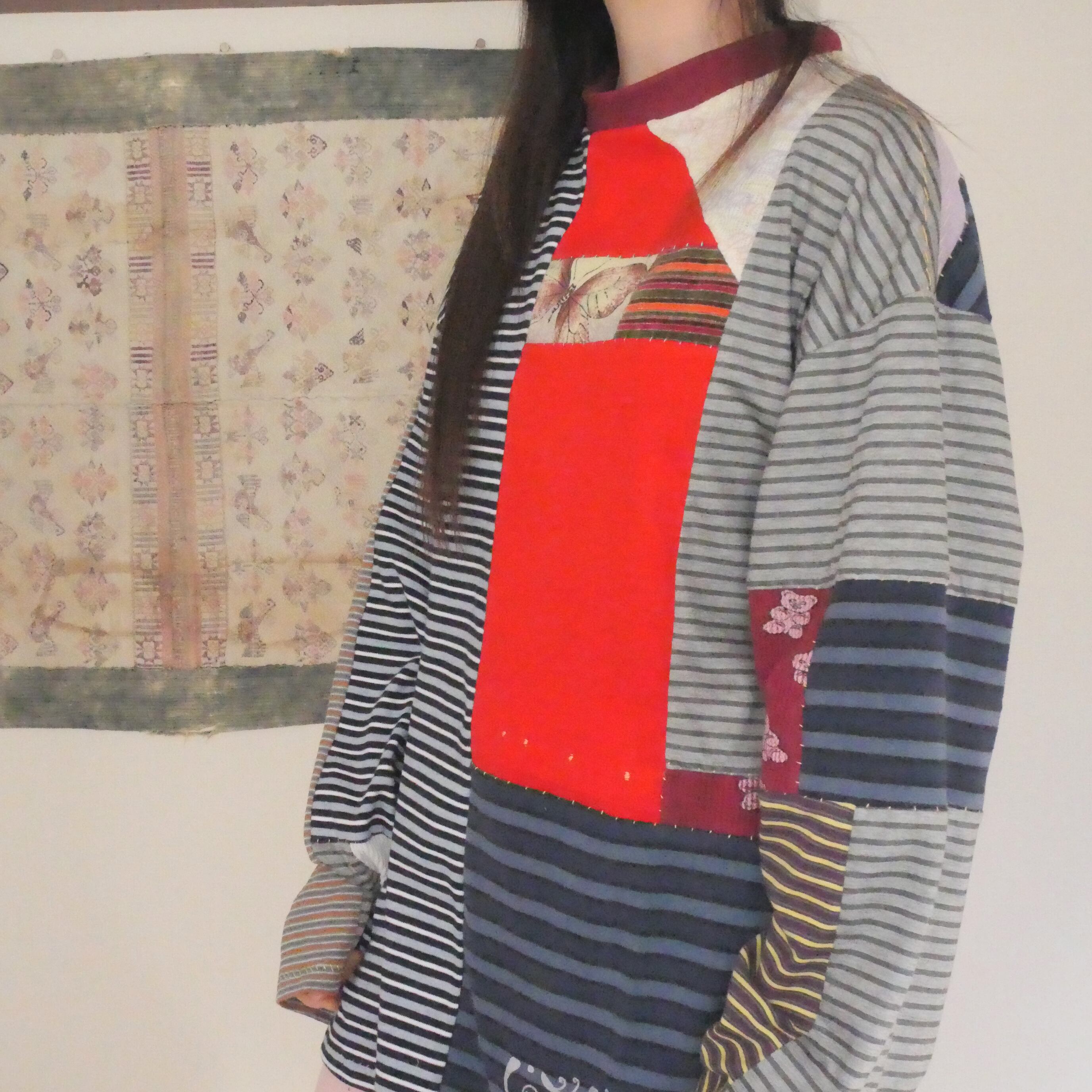 ヴィンテージのしましまシャツを使って土台を構成し、サーマル生地をパッチワークしました。