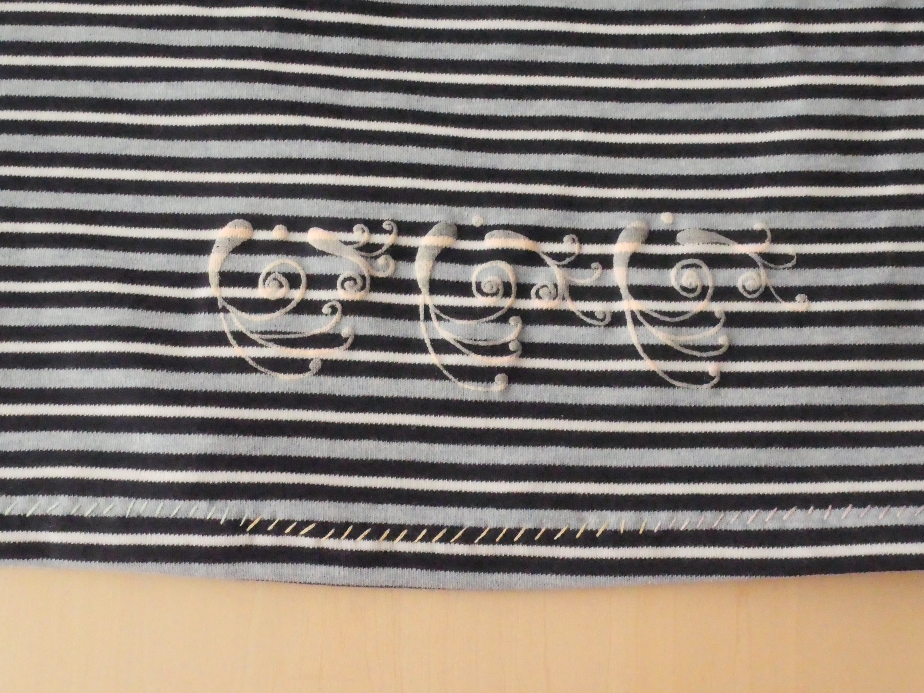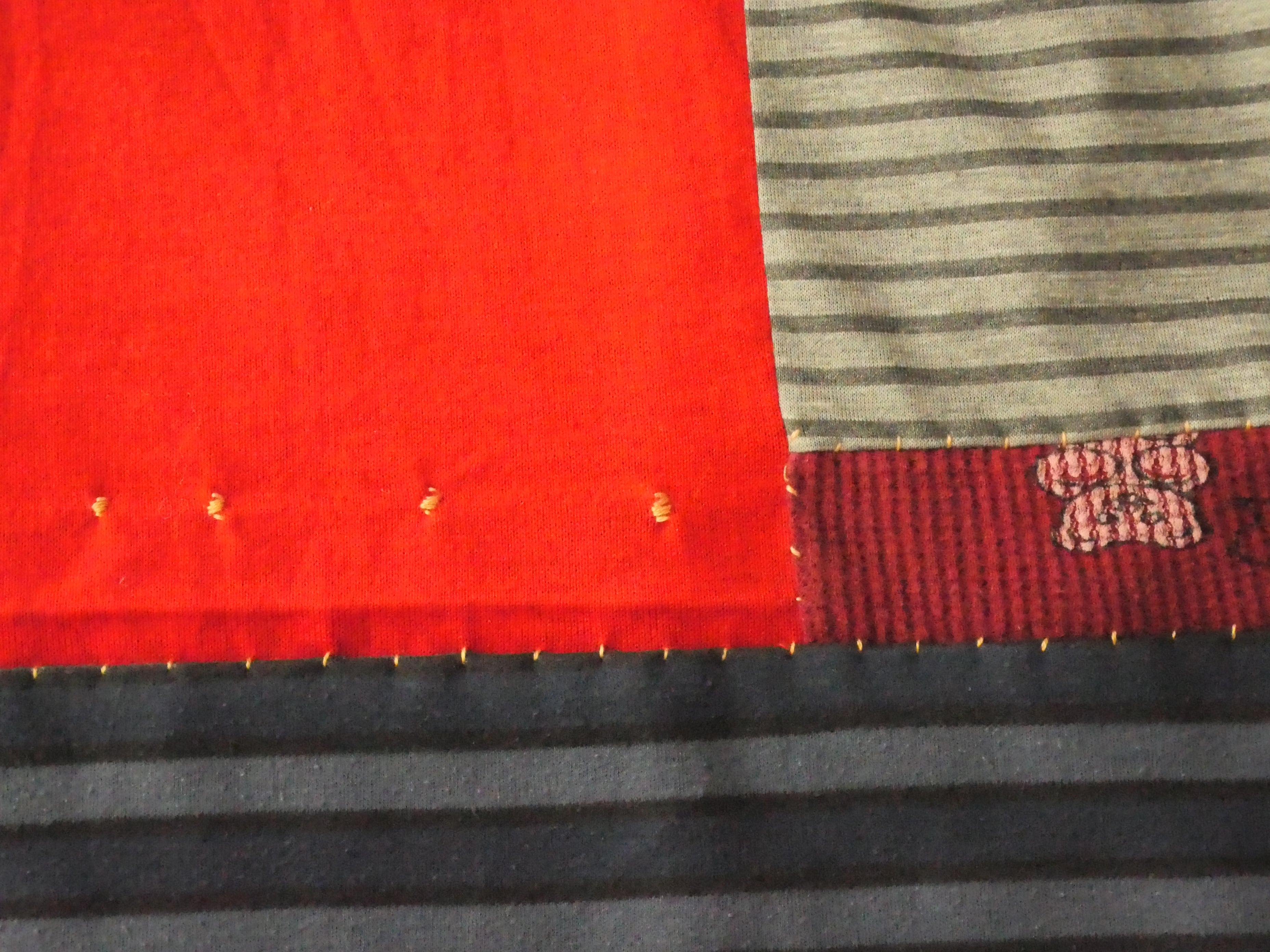パッチワーク部分や裾などに刺繍糸でハンドステッチ。全体のバランスを考えながら刺繍糸の色を決めました。