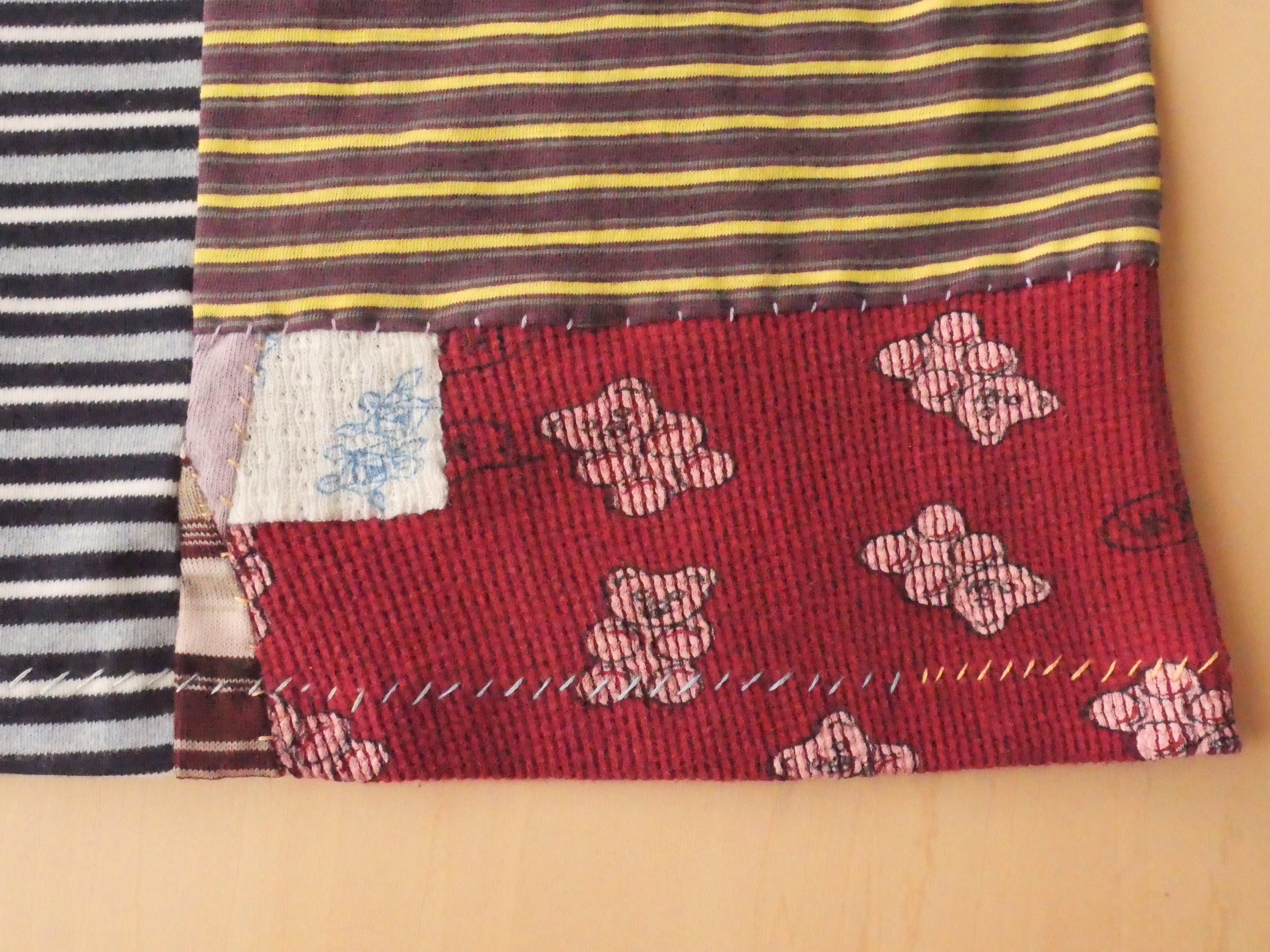 パッチワーク部分や裾などに刺繍糸でハンドステッチ。全体のバランスを考えながら刺繍糸の色を決めました。