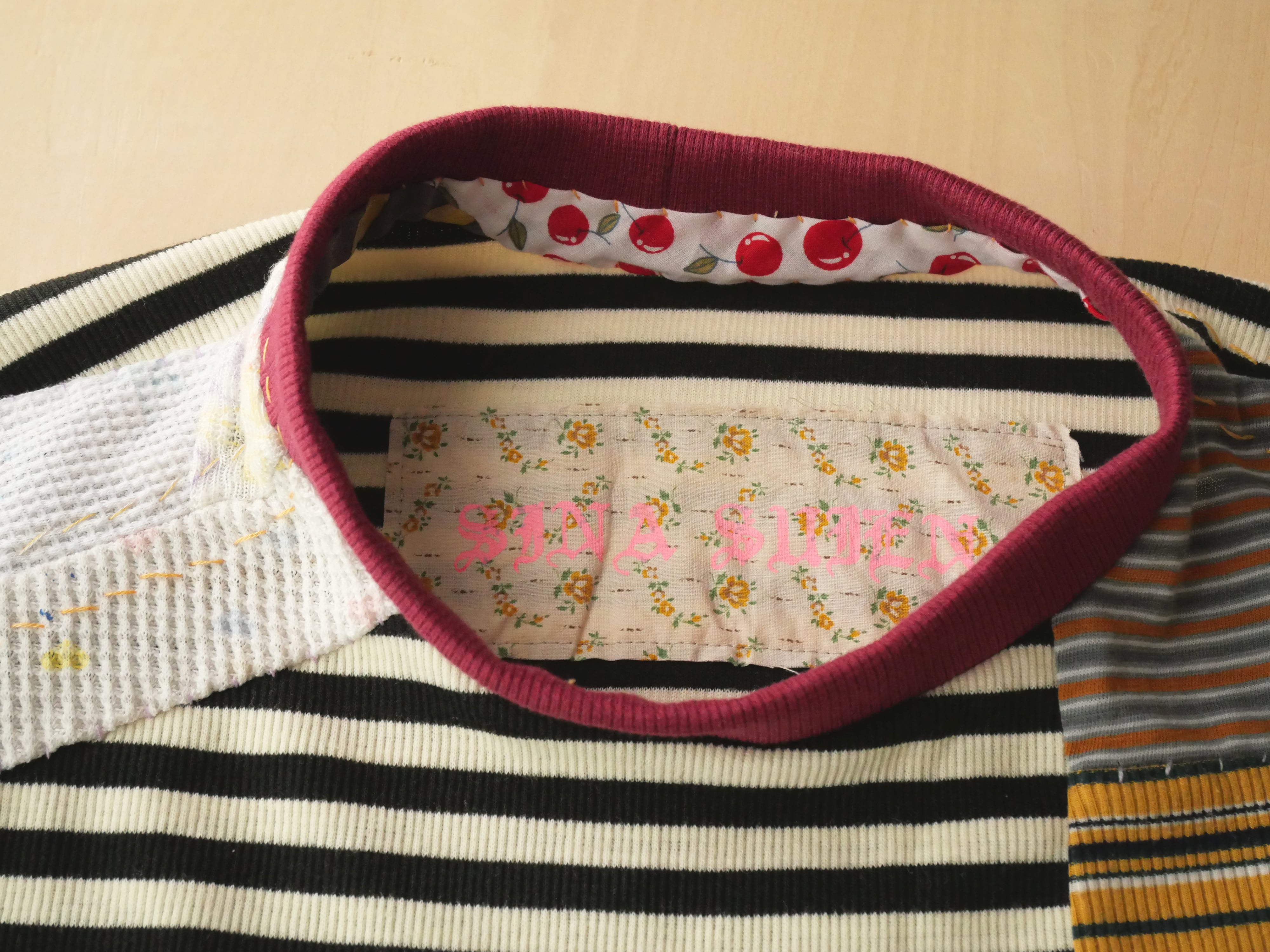 首周りの内側にはヴィンテージのスカーフを使った当て布を縫い付けています。ウサギ小屋ロゴのスペシャル花柄タグは後ろ見頃の裾にミシンステッチ。
