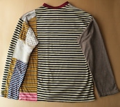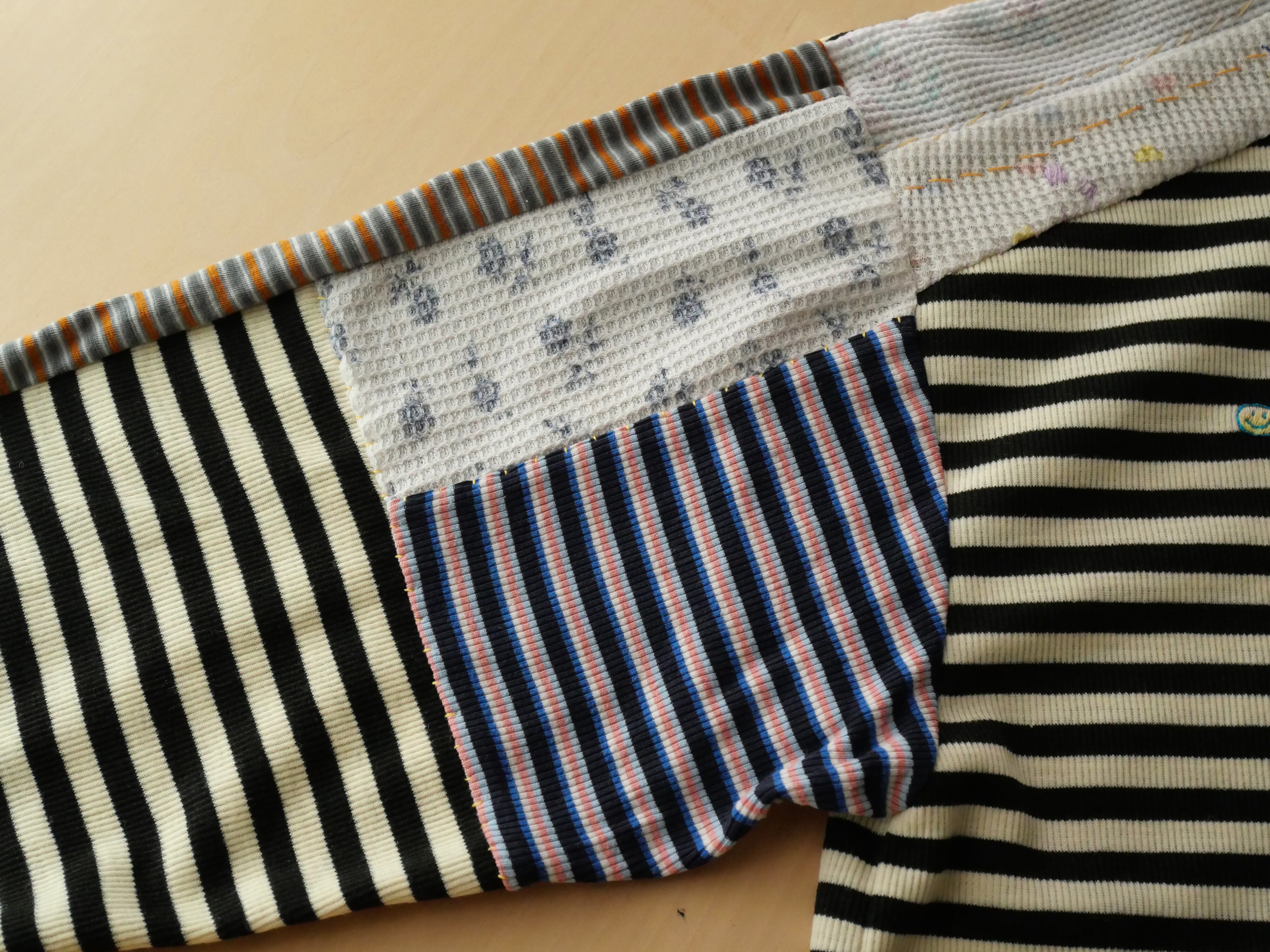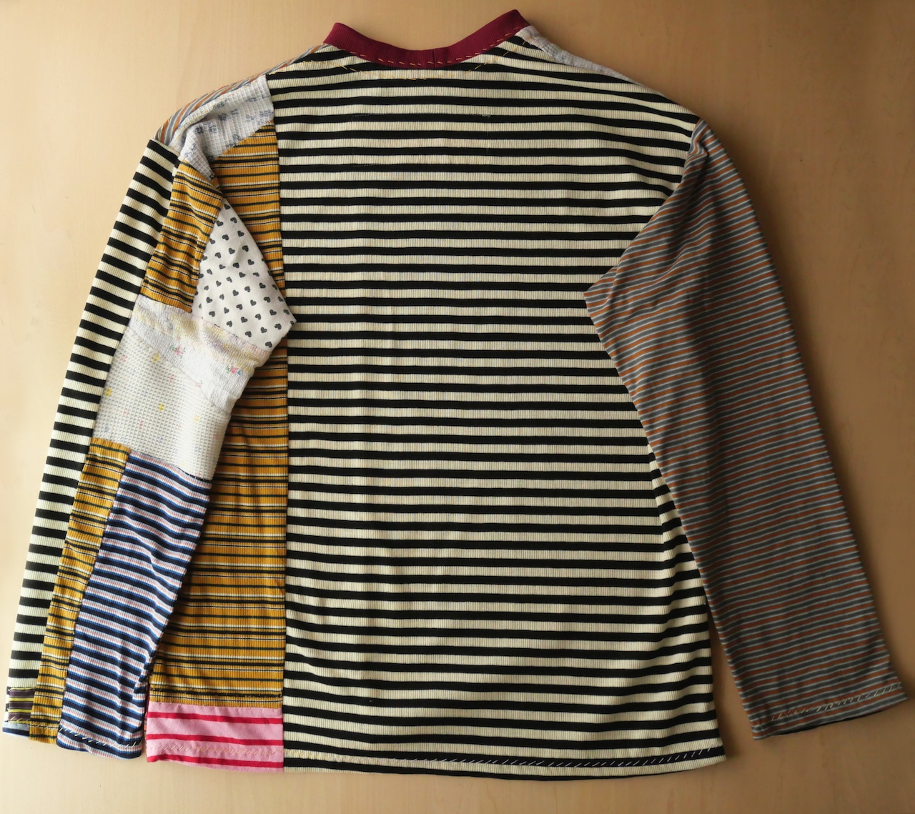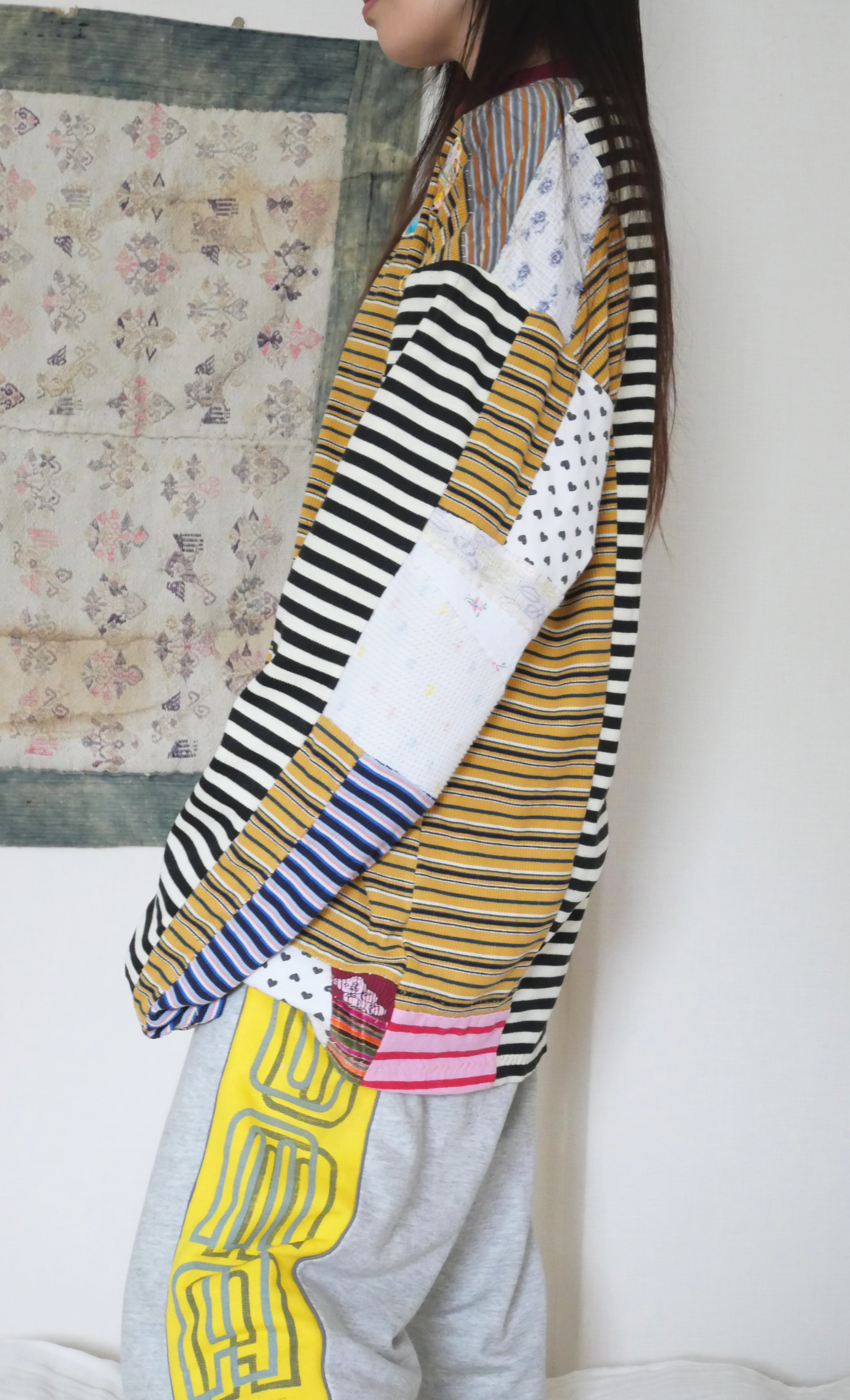 ヴィンテージのしましまシャツを使って土台を構成し、サーマル生地をパッチワークしました。
