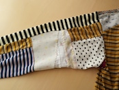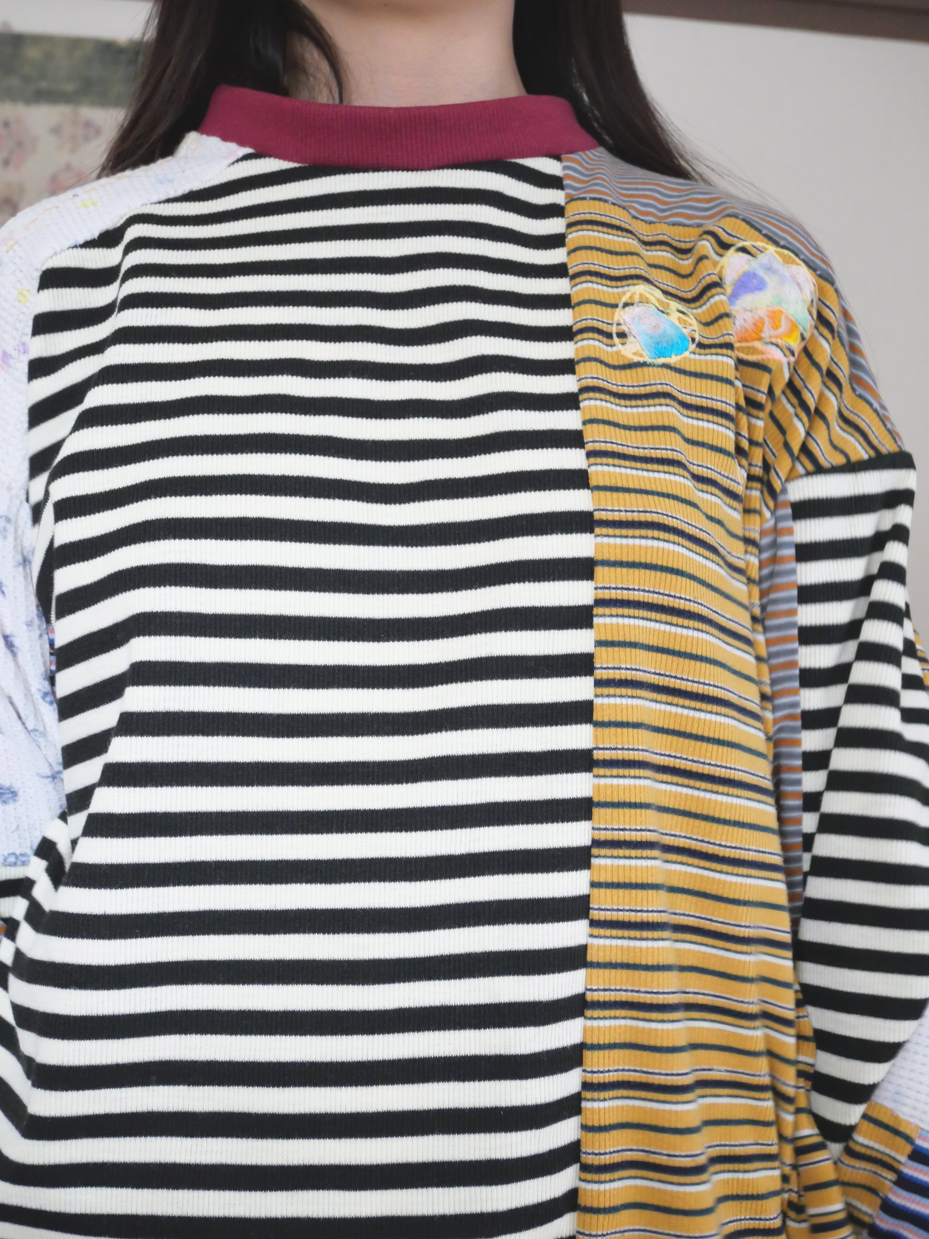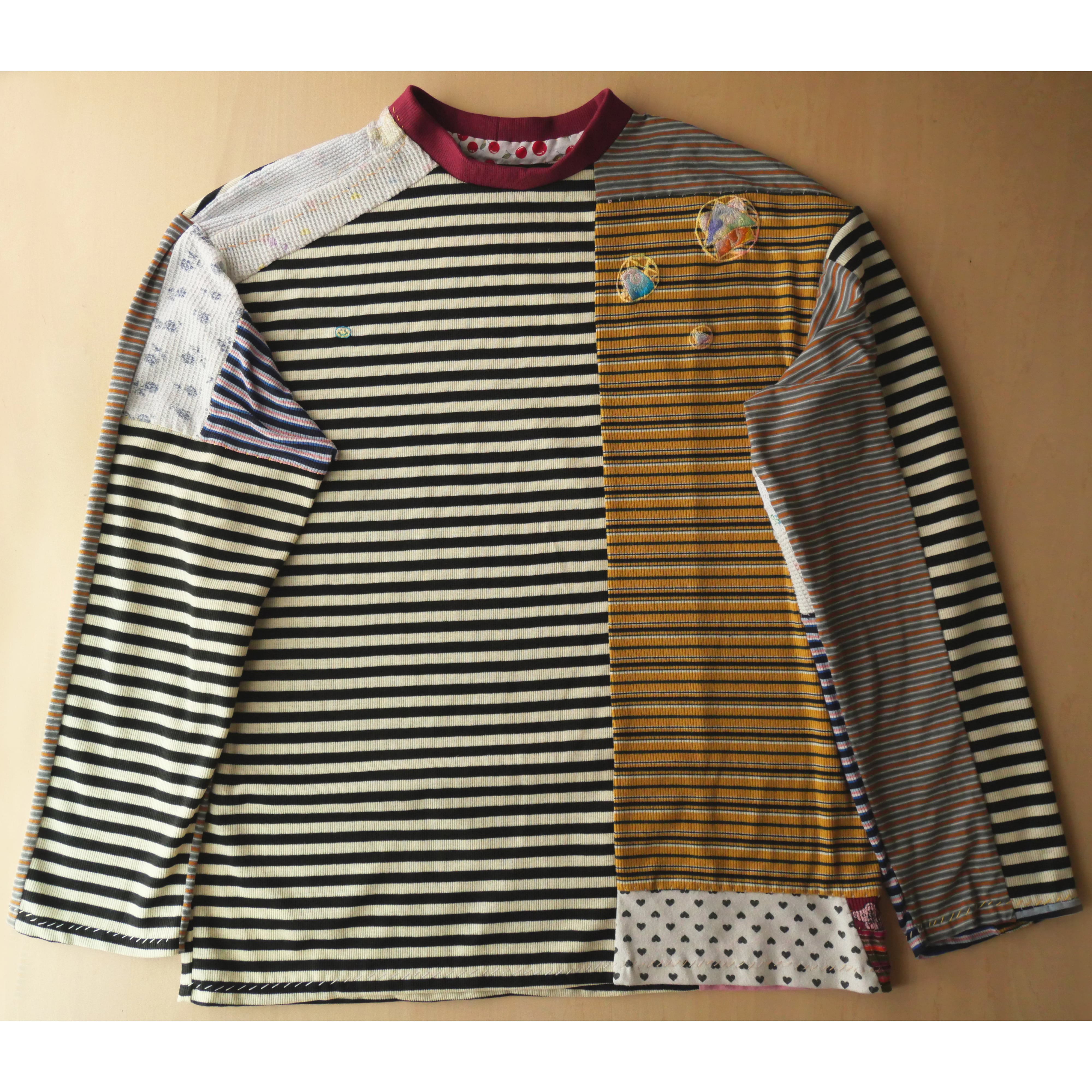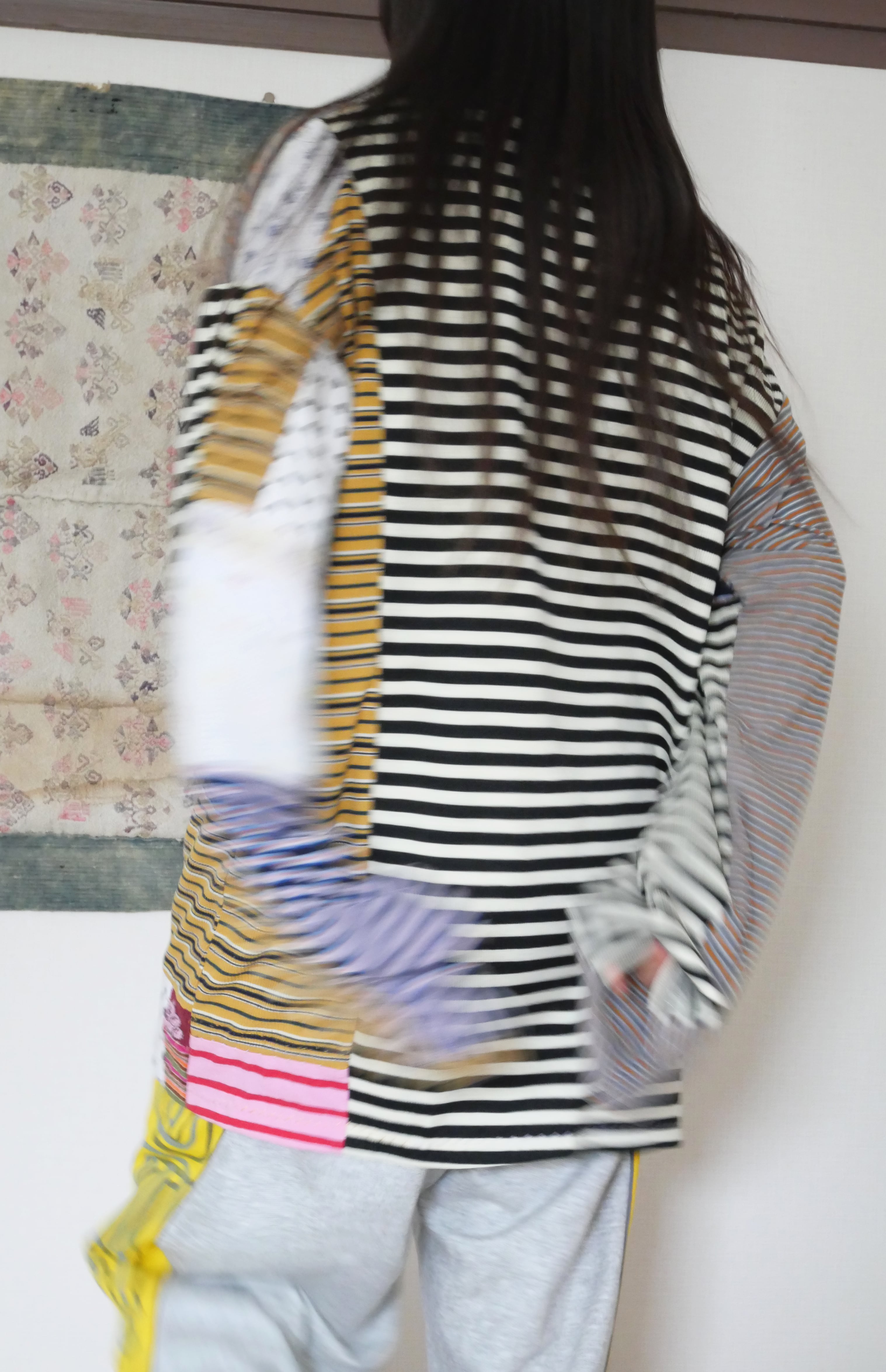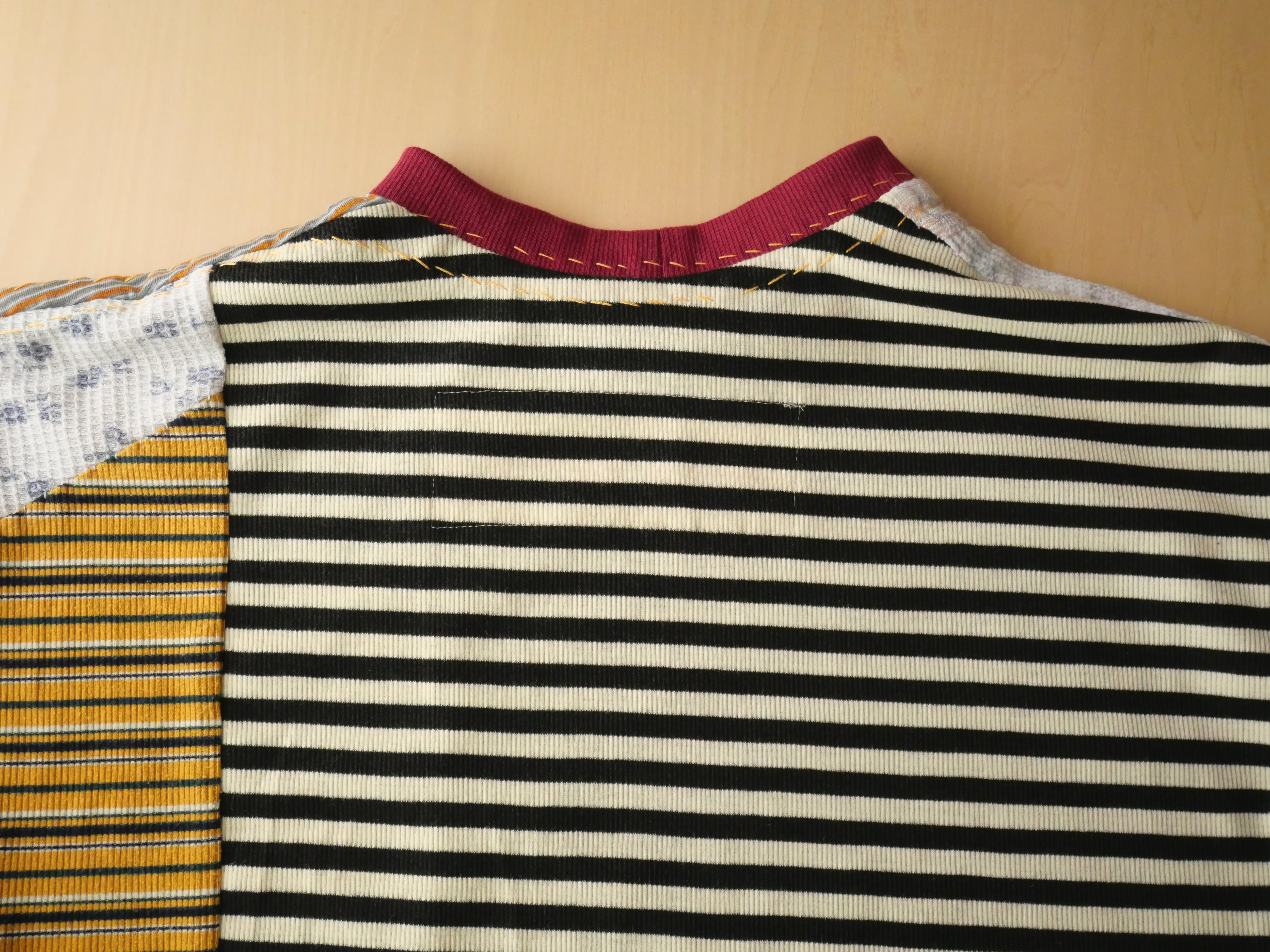 ヴィンテージのしましまシャツを使って土台を構成し、サーマル生地をパッチワークしました。