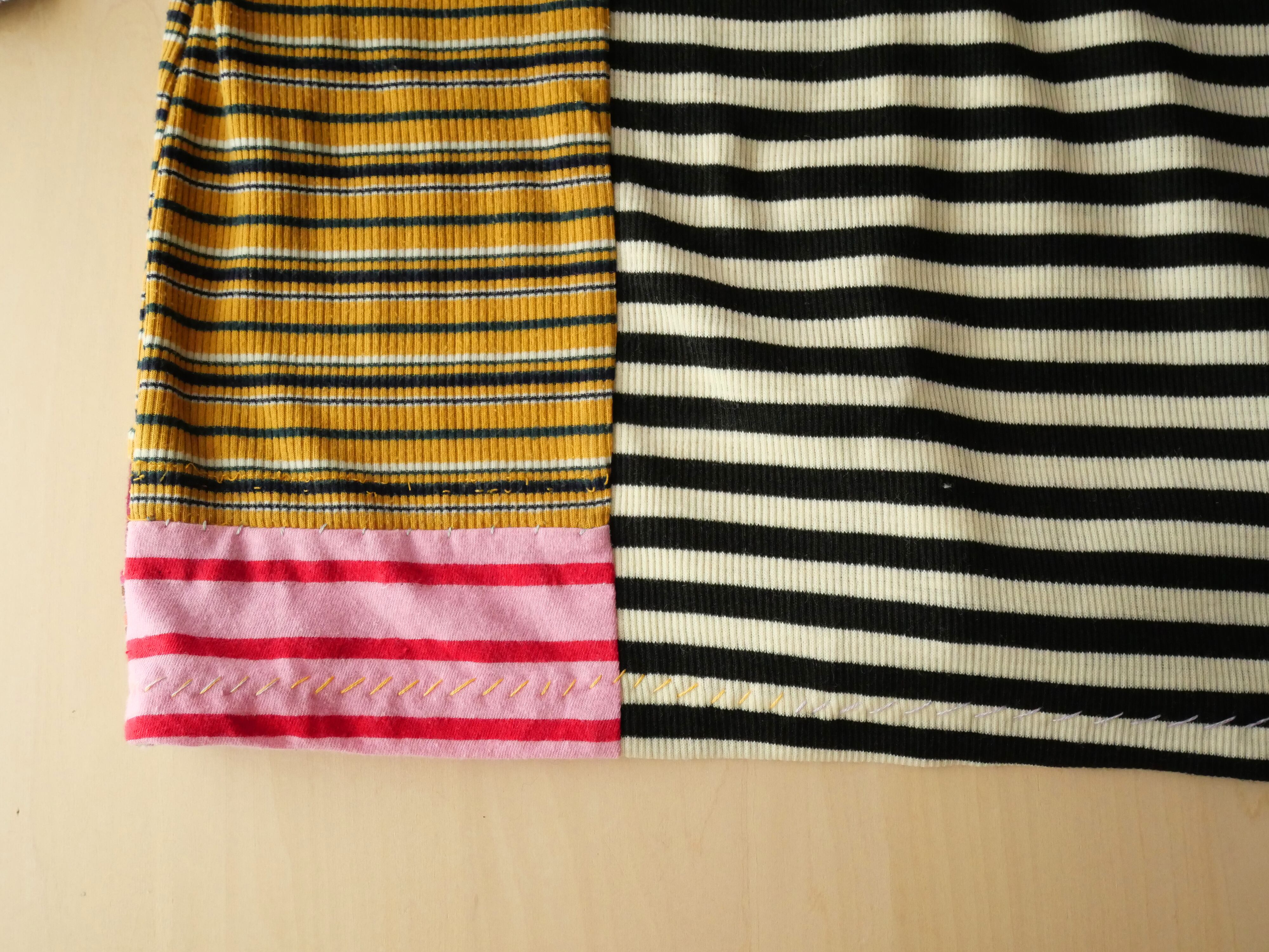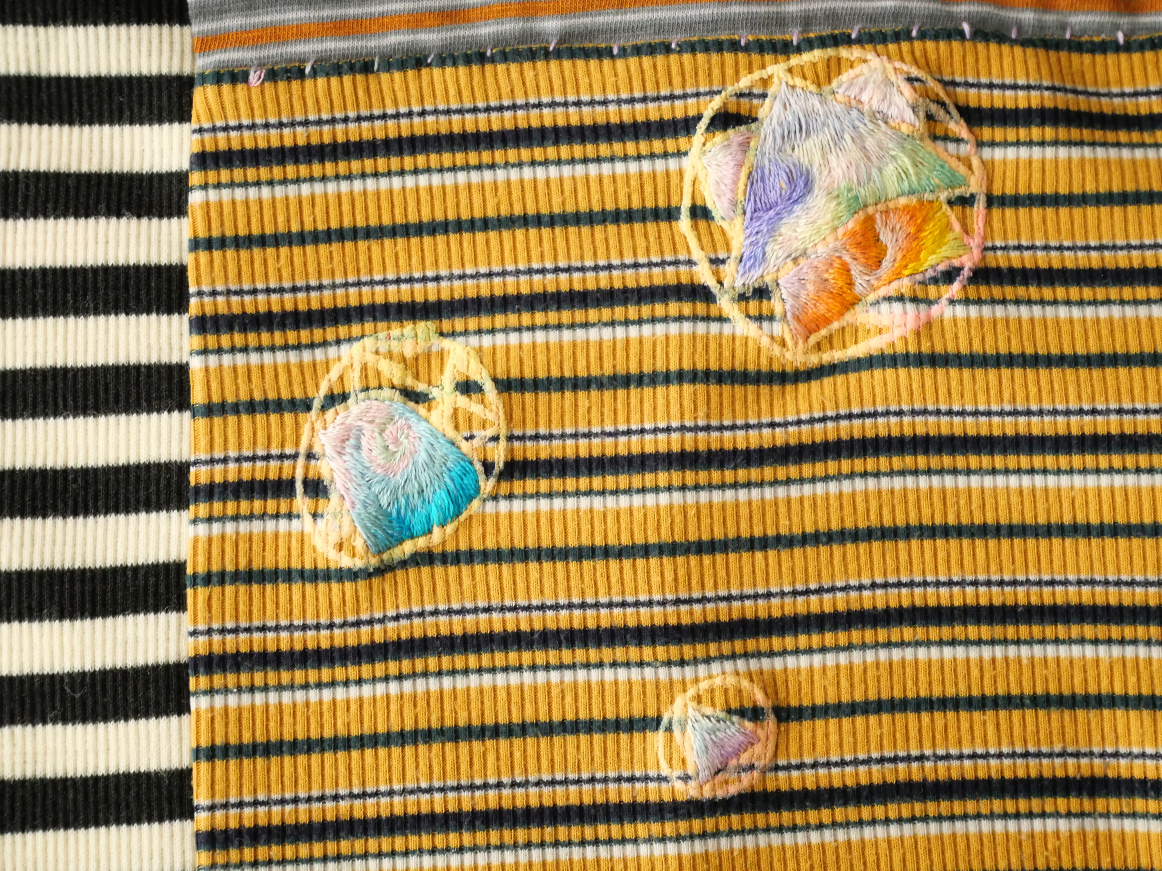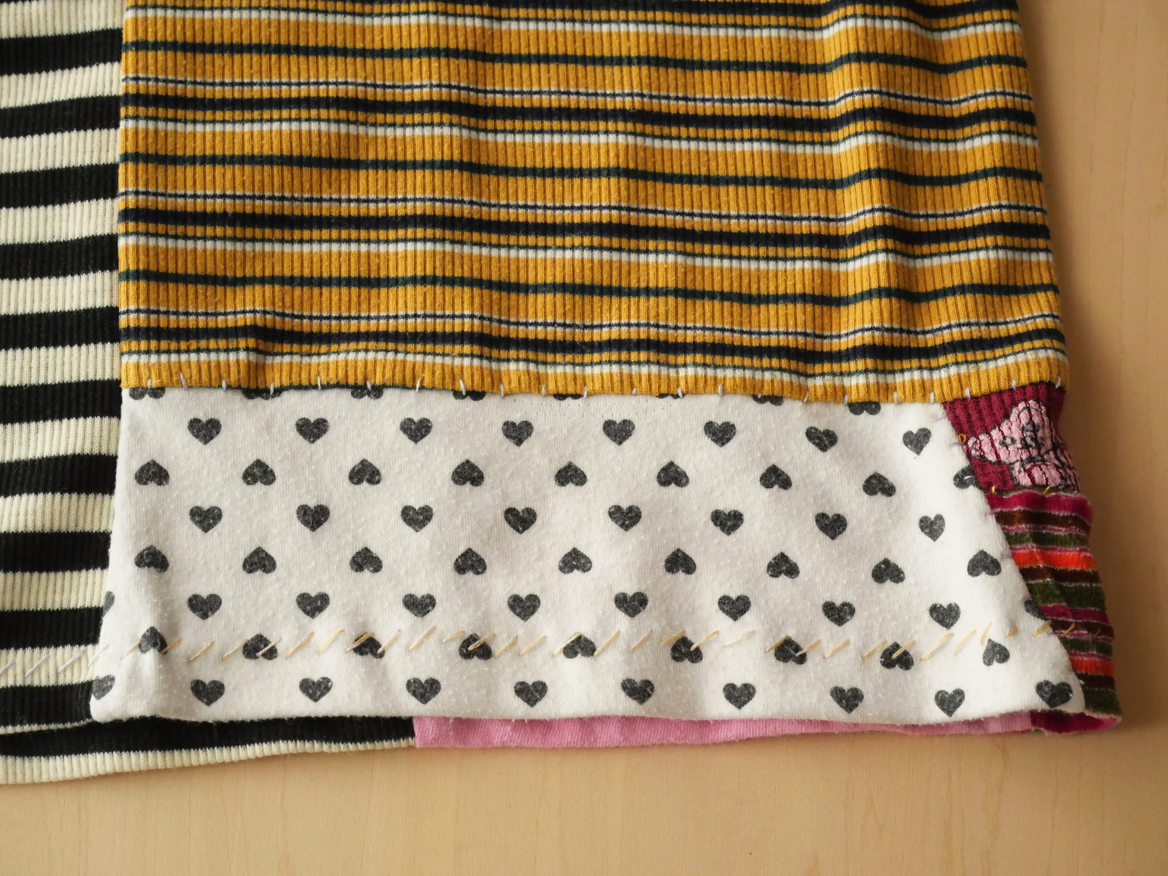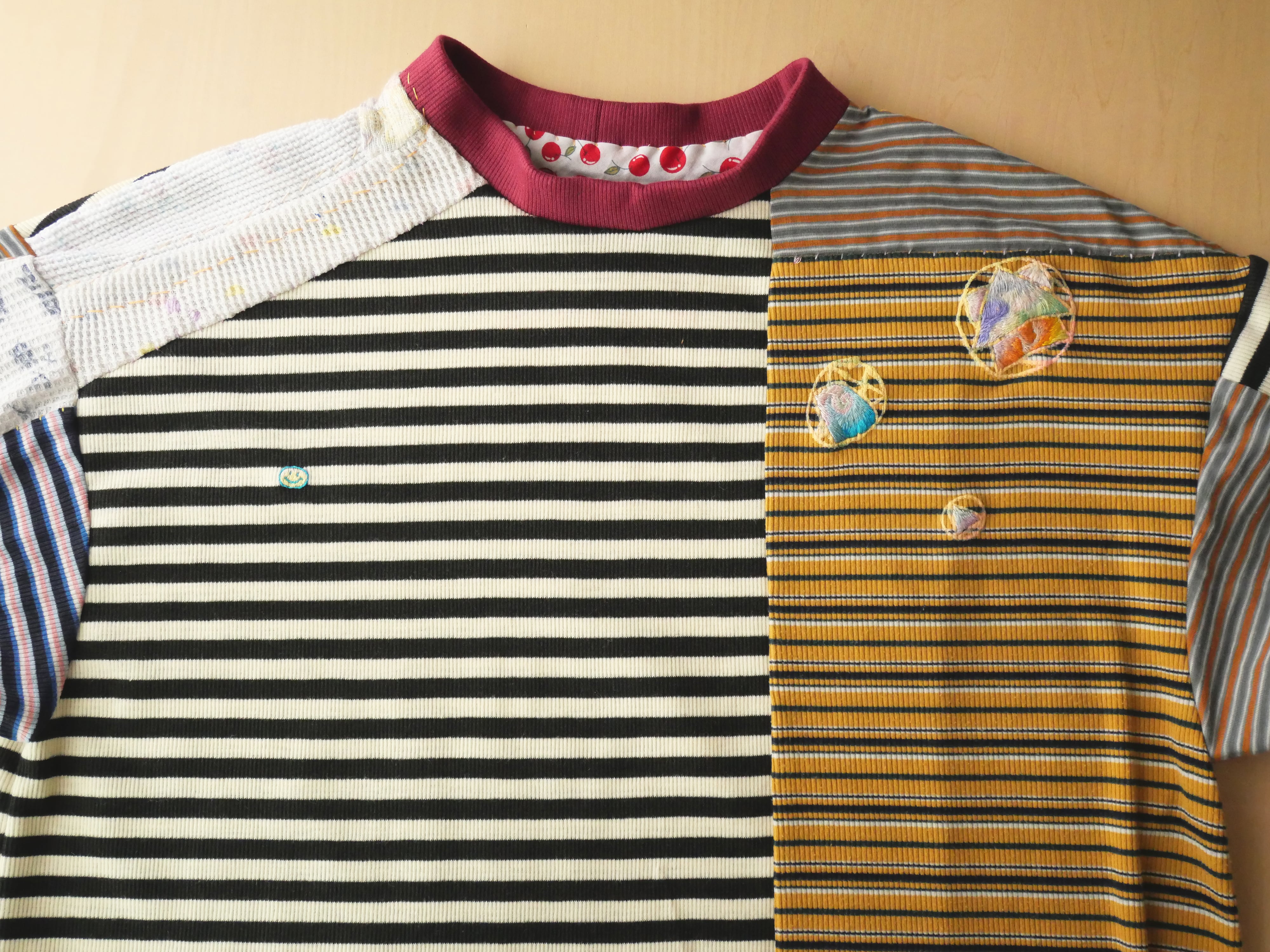 パッチワーク部分や裾などに刺繍糸でハンドステッチ。全体のバランスを考えながら刺繍糸の色を決めました。