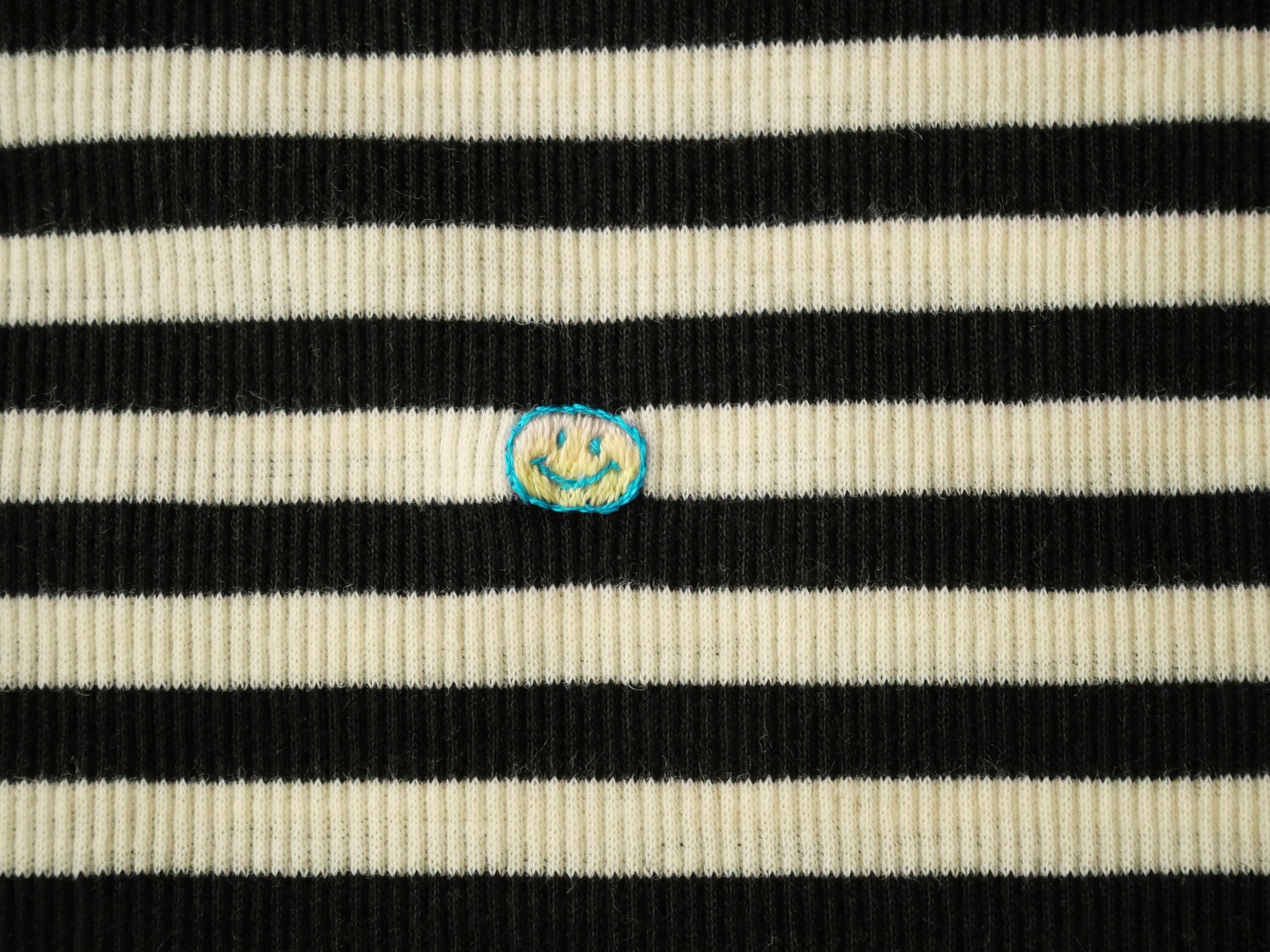 ハート柄、からし色のシマシマの生地、海外のグミのクマのキャラクターがEAT MEと言っている模様のサーマル生地がチャームポイントです。