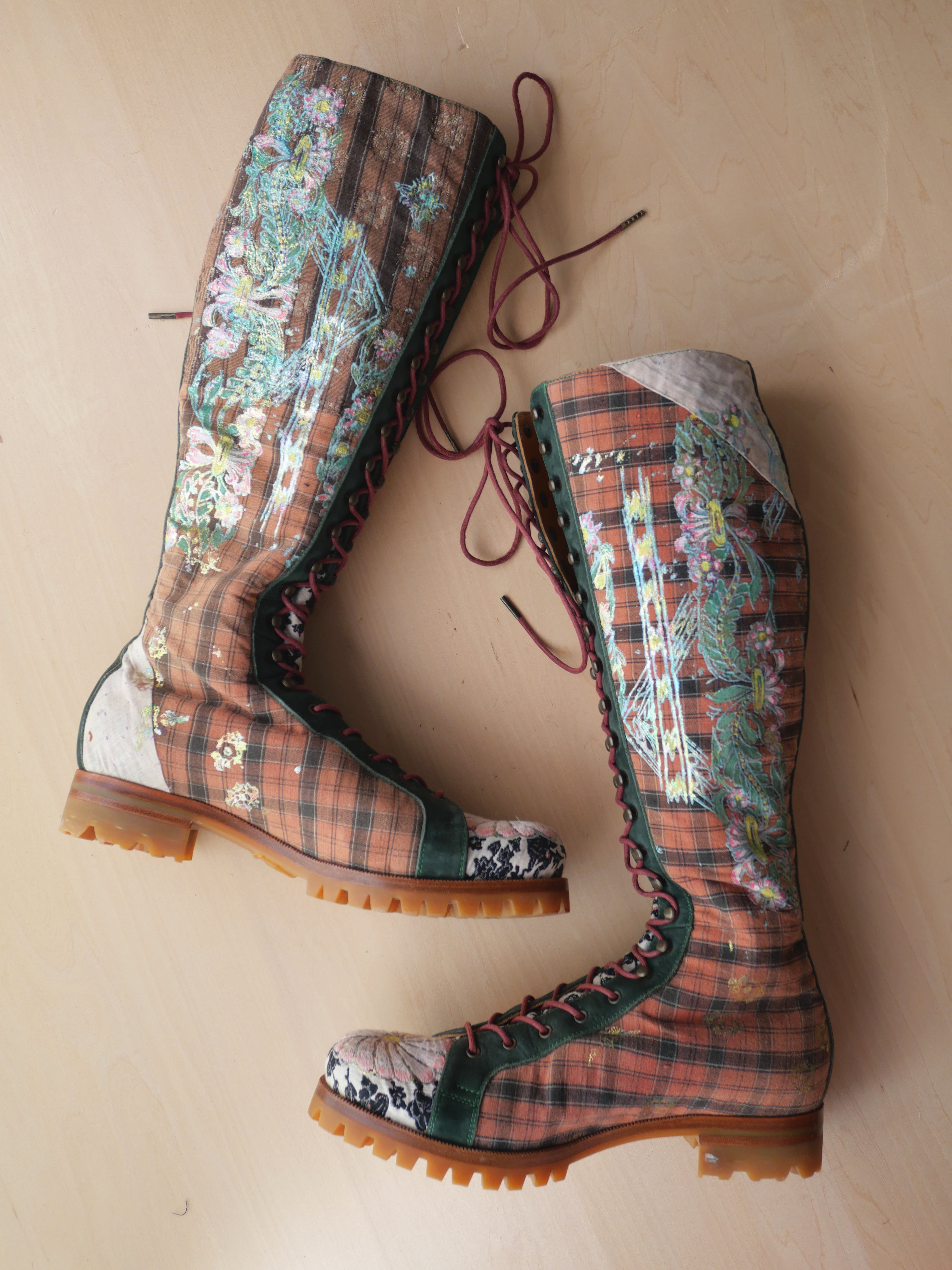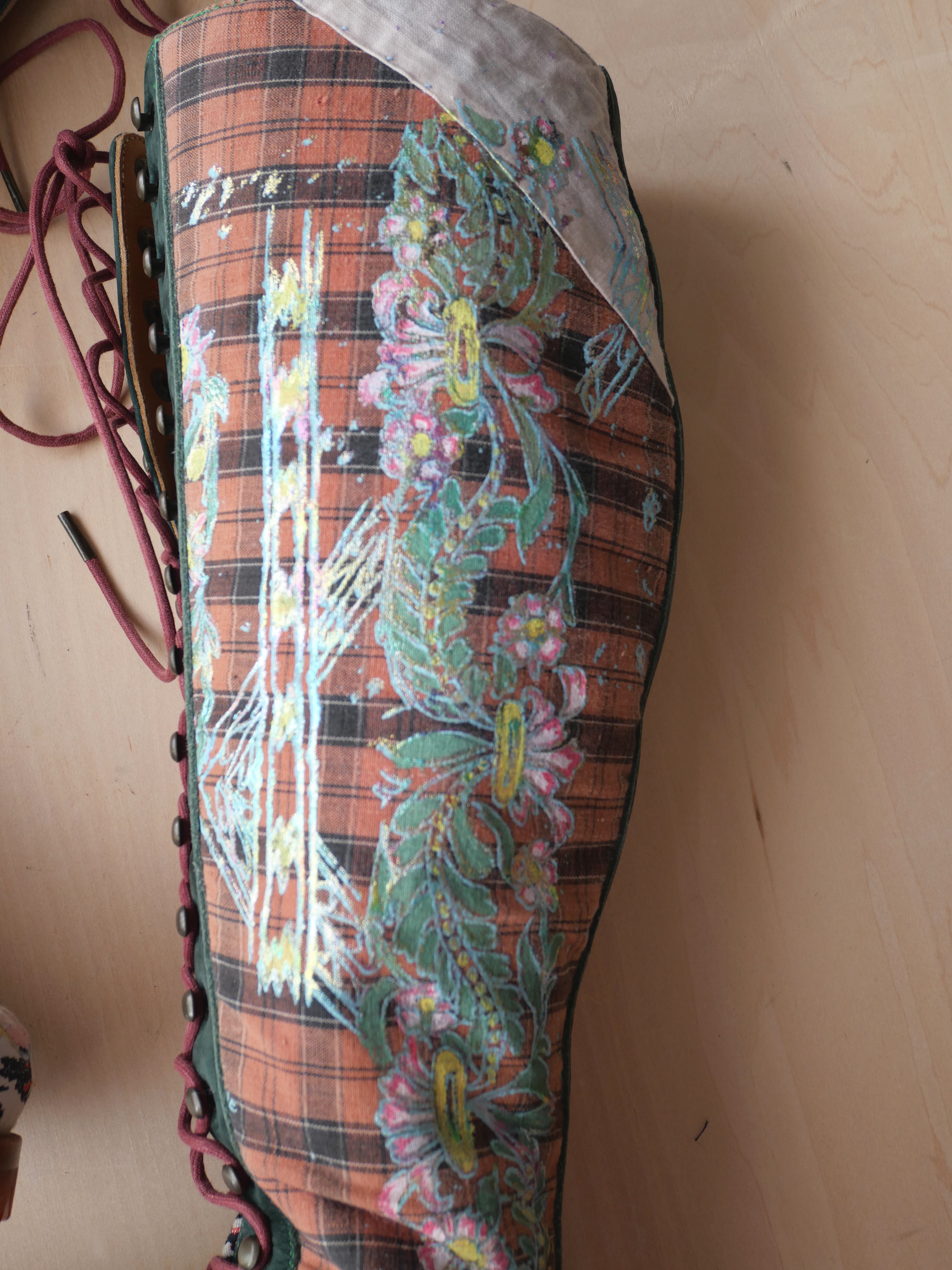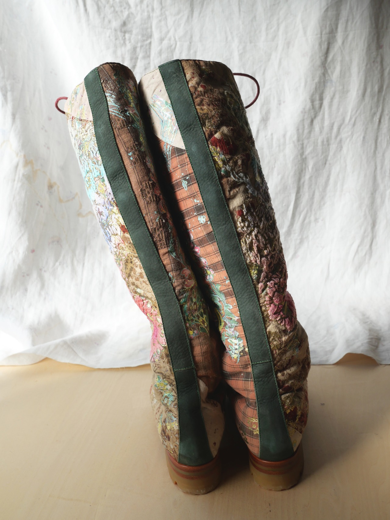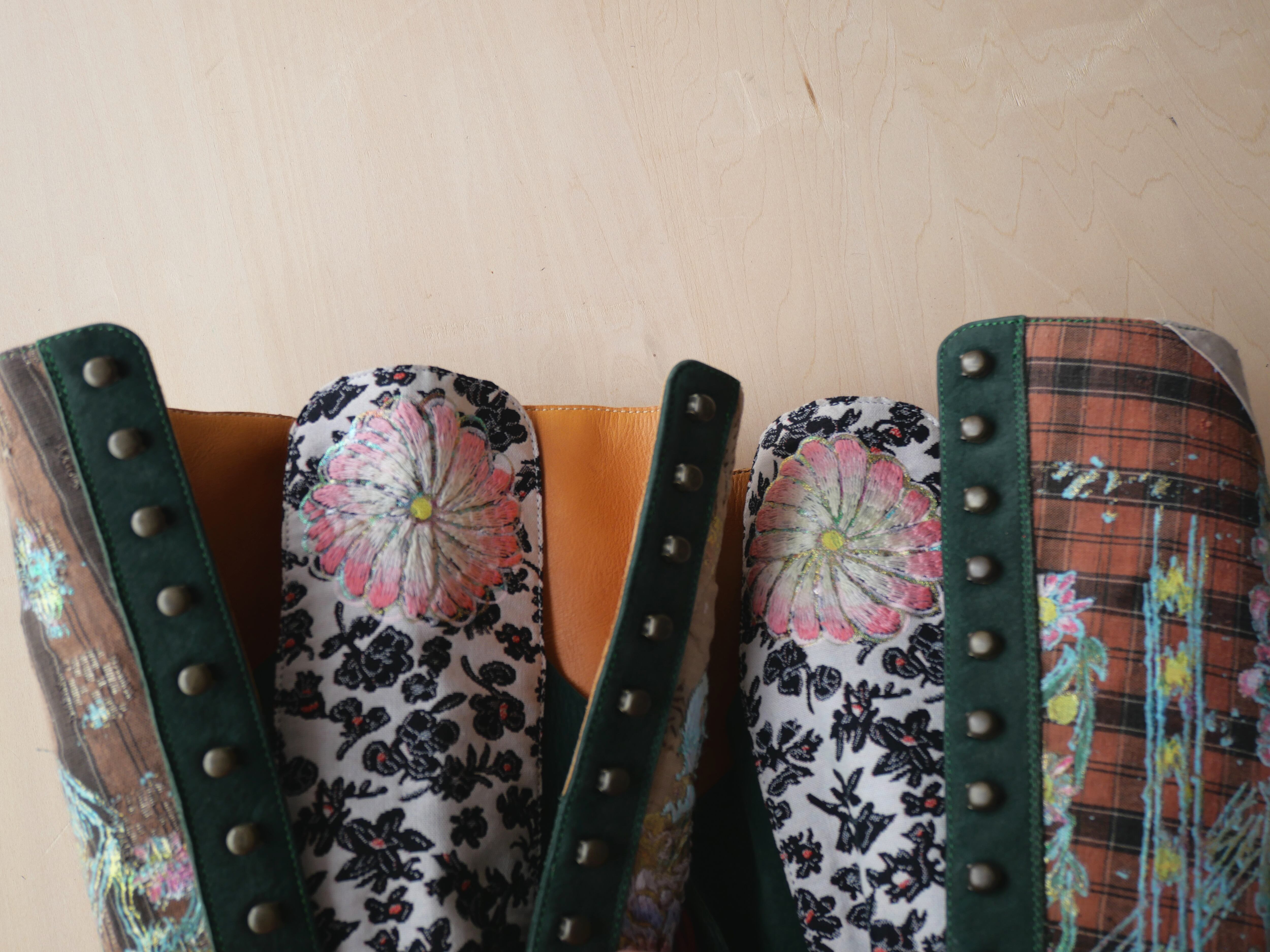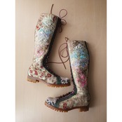 ハンドペイントや箔プリント、ヴィンテージの民族衣装のパッチワークに贅沢な刺繍を施した1点もののブーツです。La Rificolonaさんとの共作。