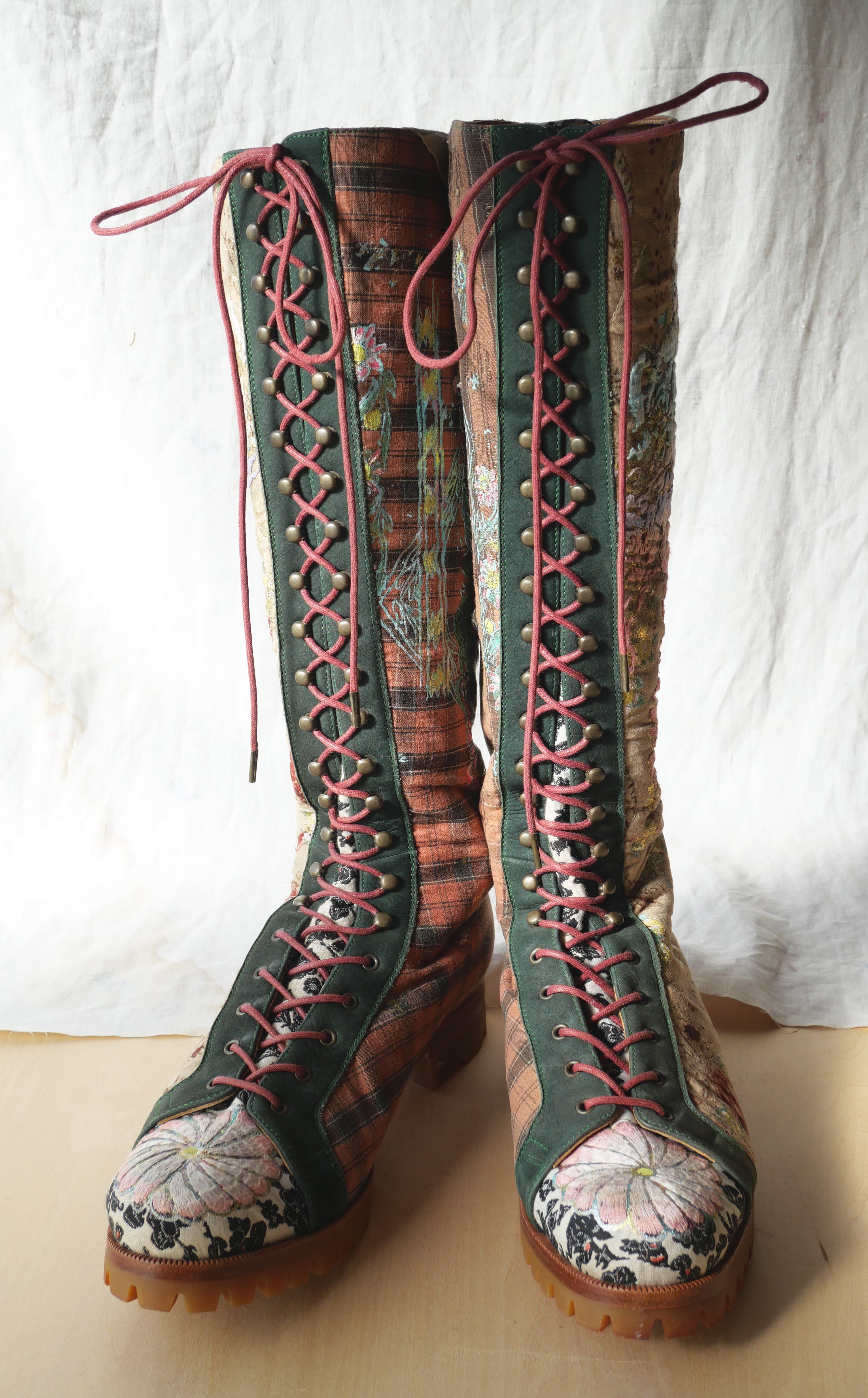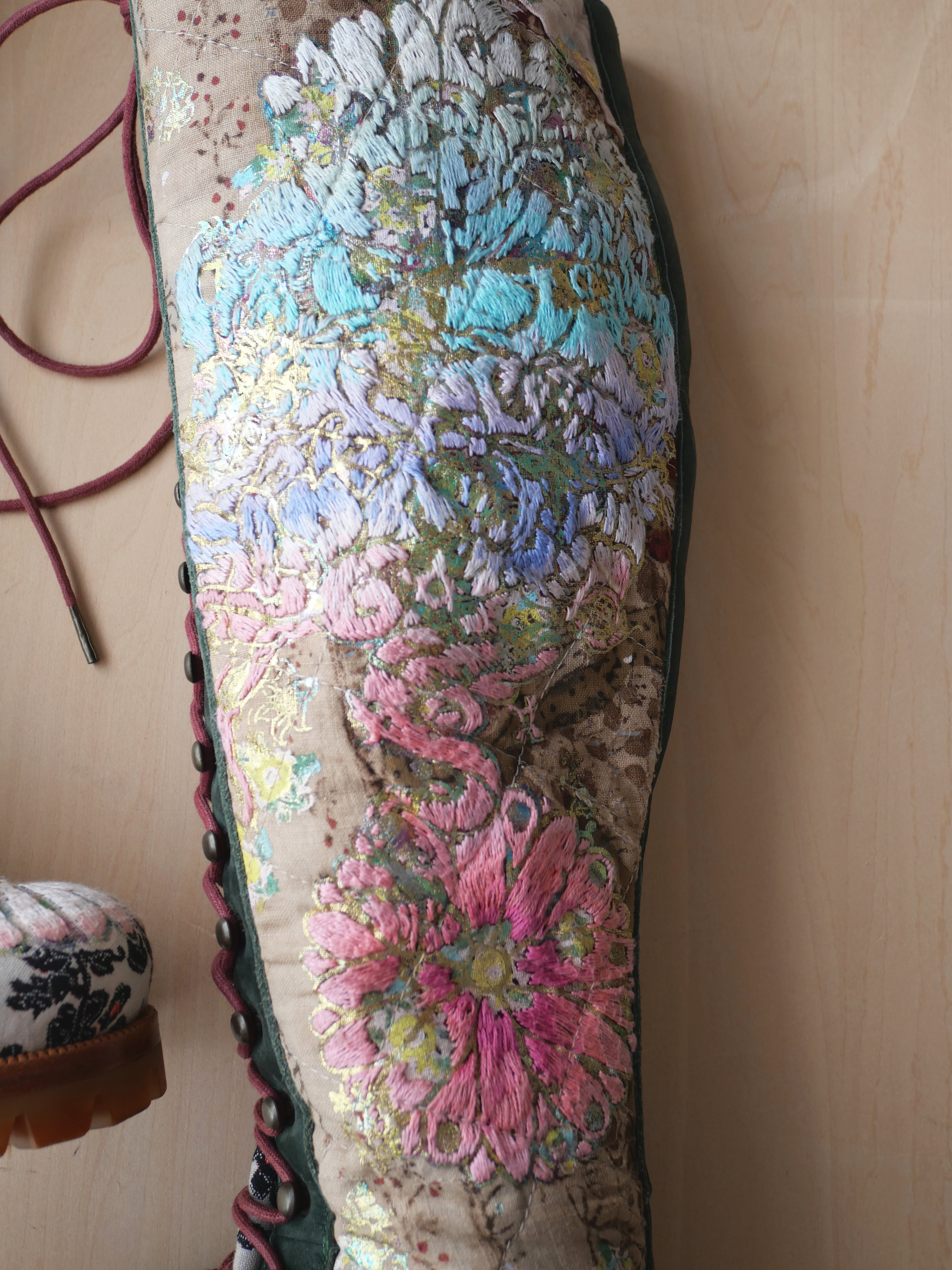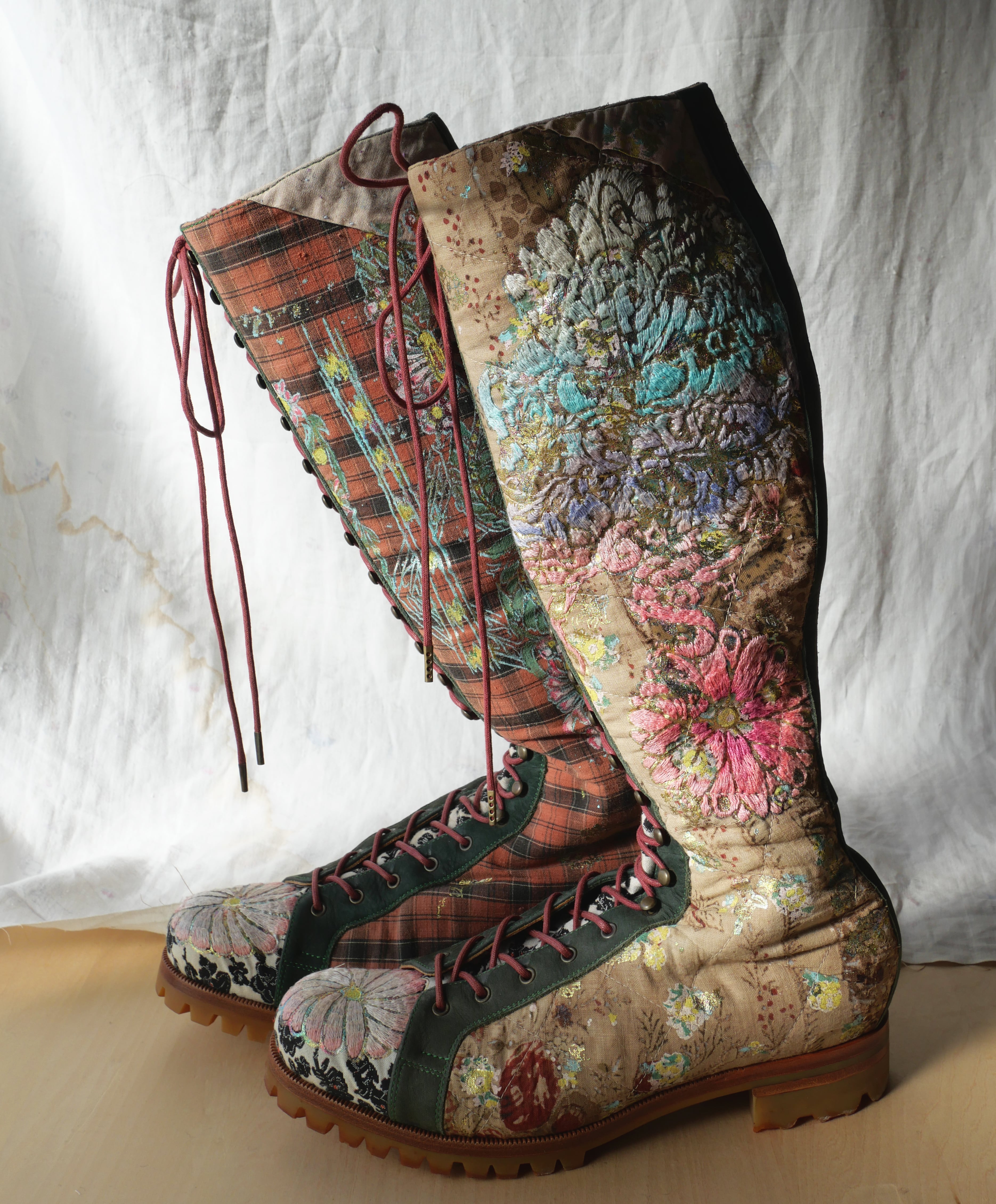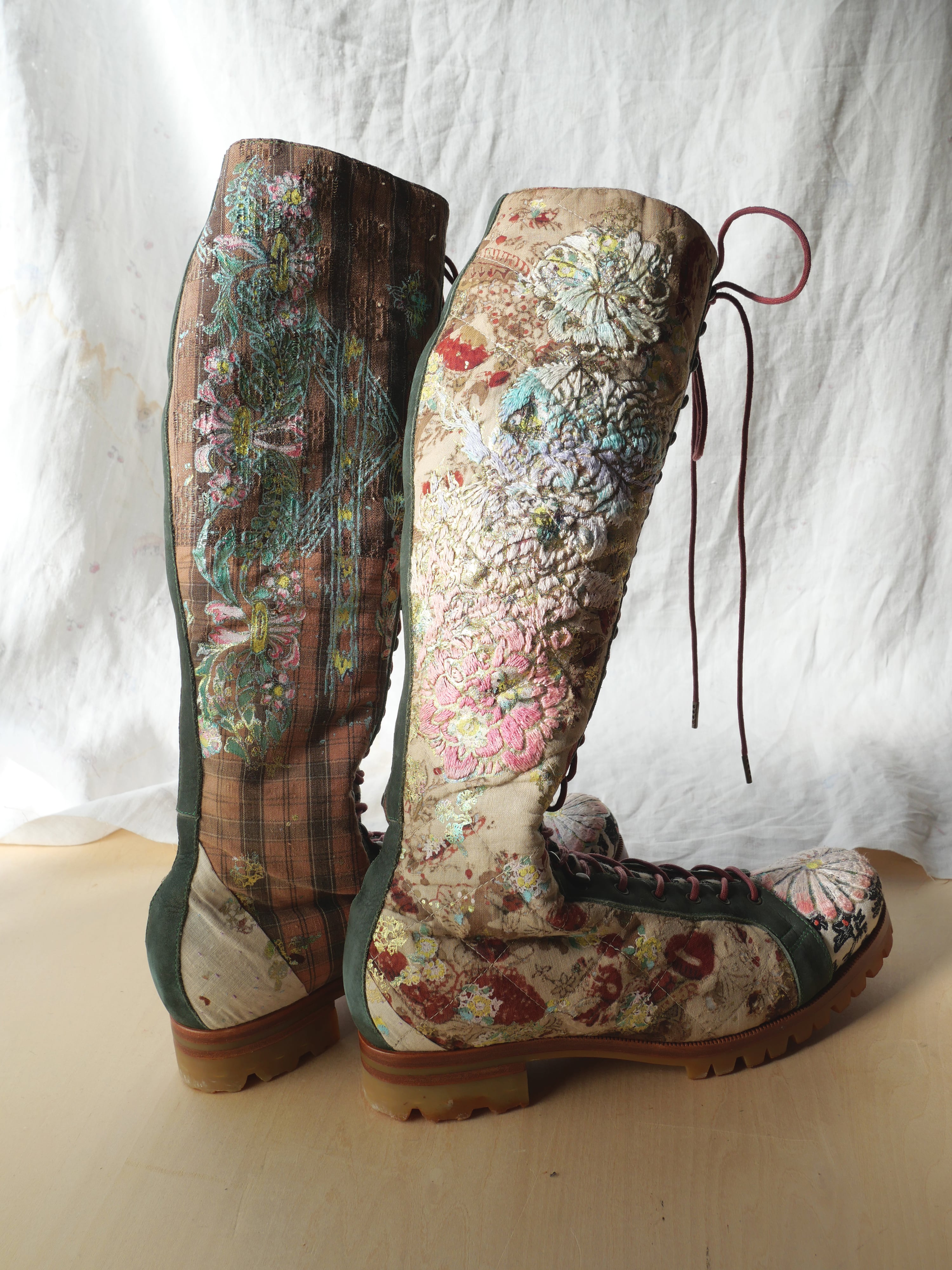 ハンドペイントや箔プリント、ヴィンテージの民族衣装のパッチワークに贅沢な刺繍を施した1点もののブーツです。La Rificolonaさんとの共作。