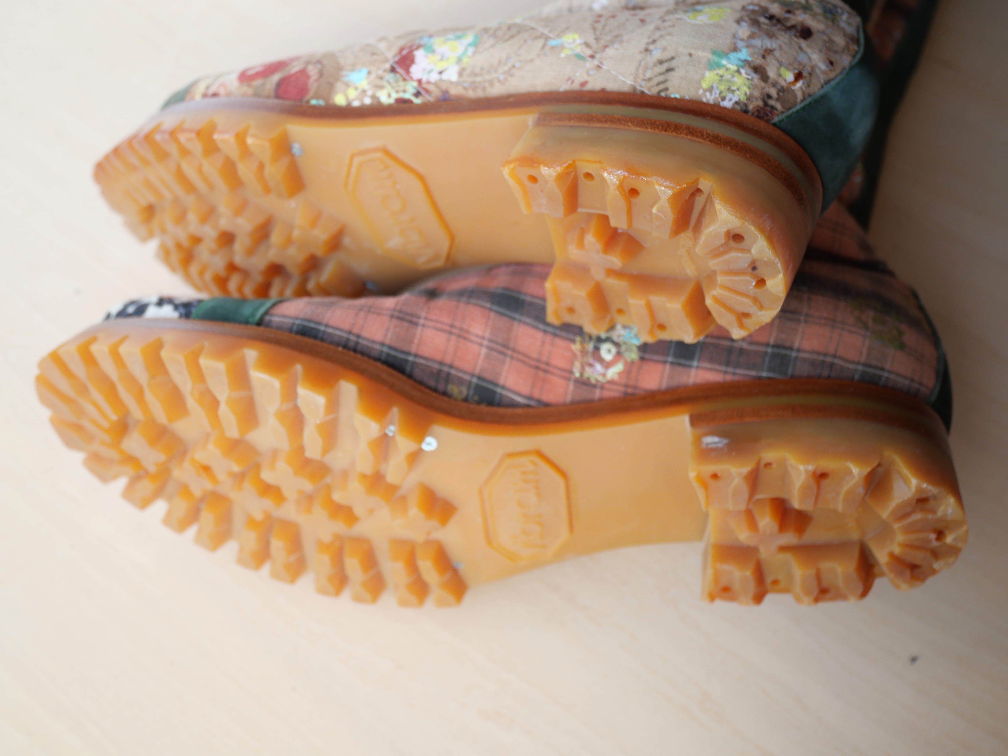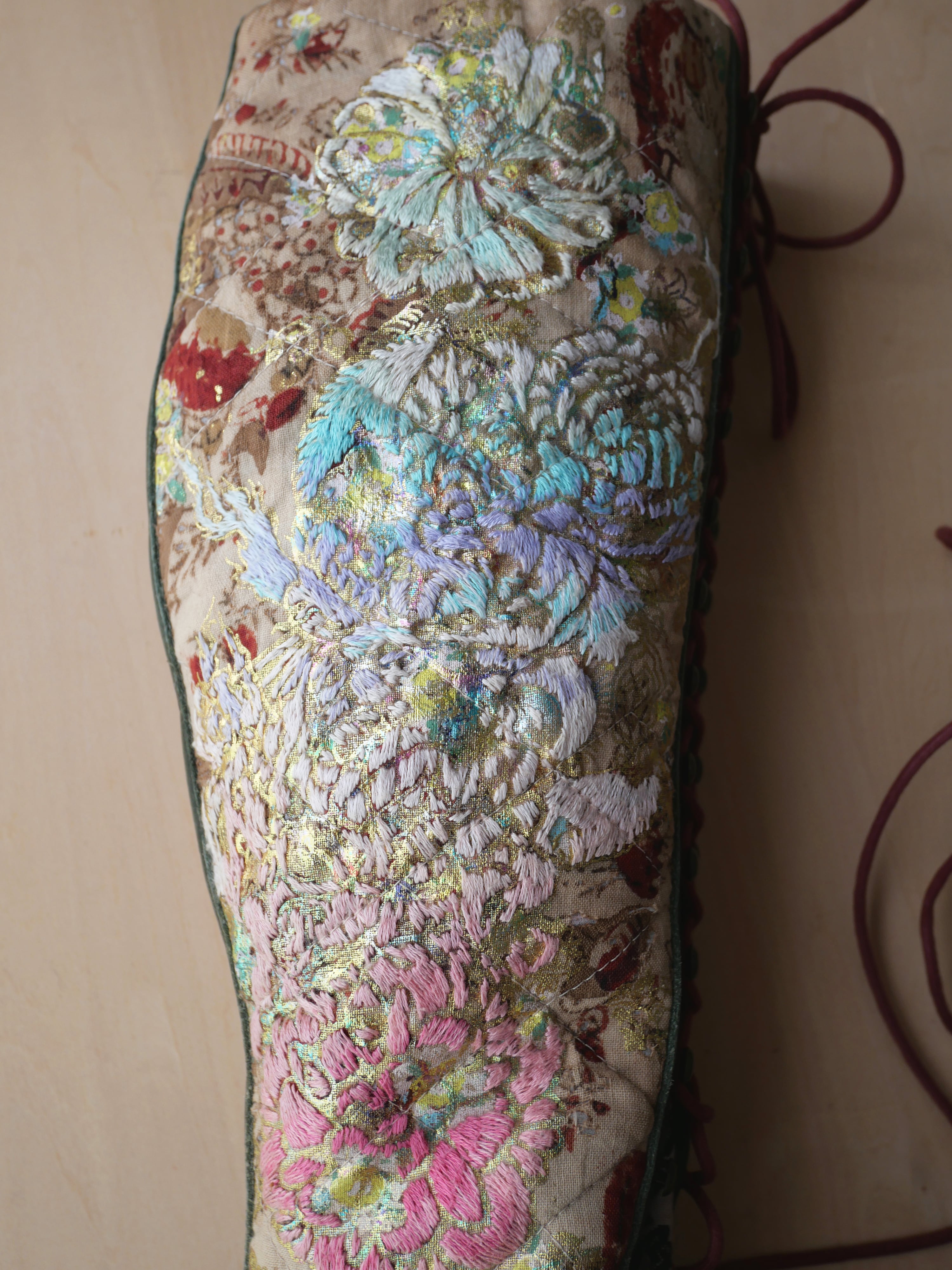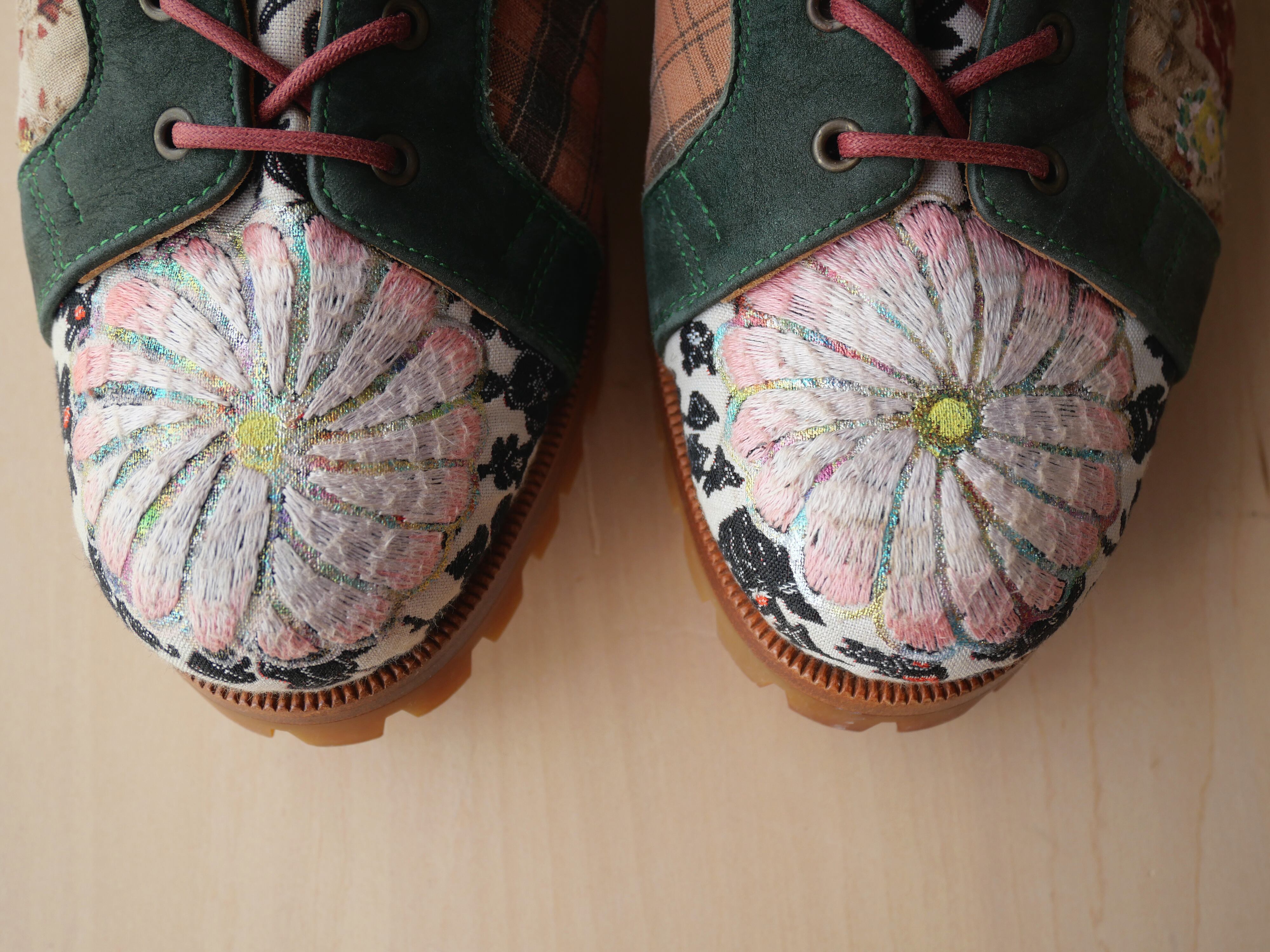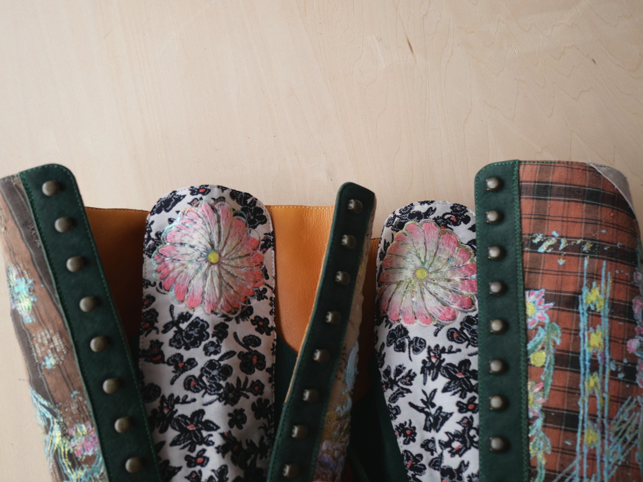 ハンドペイントや箔プリント、ヴィンテージの民族衣装のパッチワークに贅沢な刺繍を施した1点もののブーツです。La Rificolonaさんとの共作。